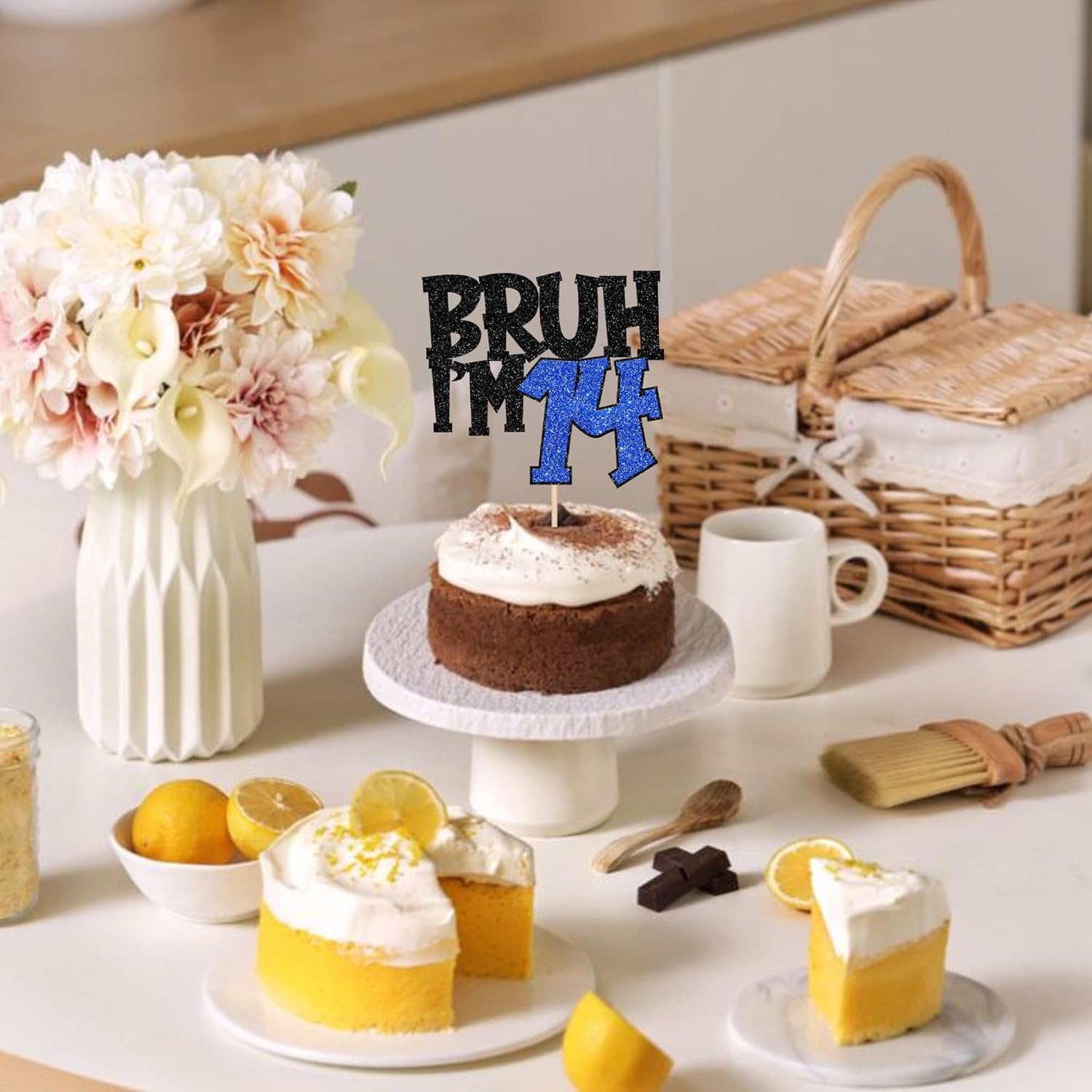 1 PCS Bruh I'm 14 Cake Topper Glitter Happy 14th Birthday Cake Pick Bro I'm 14 Cake Decoration It's My 14th Birthday Decorations for Cheers to 14 Years Old Birthday Anniversary Party Supplies Blue