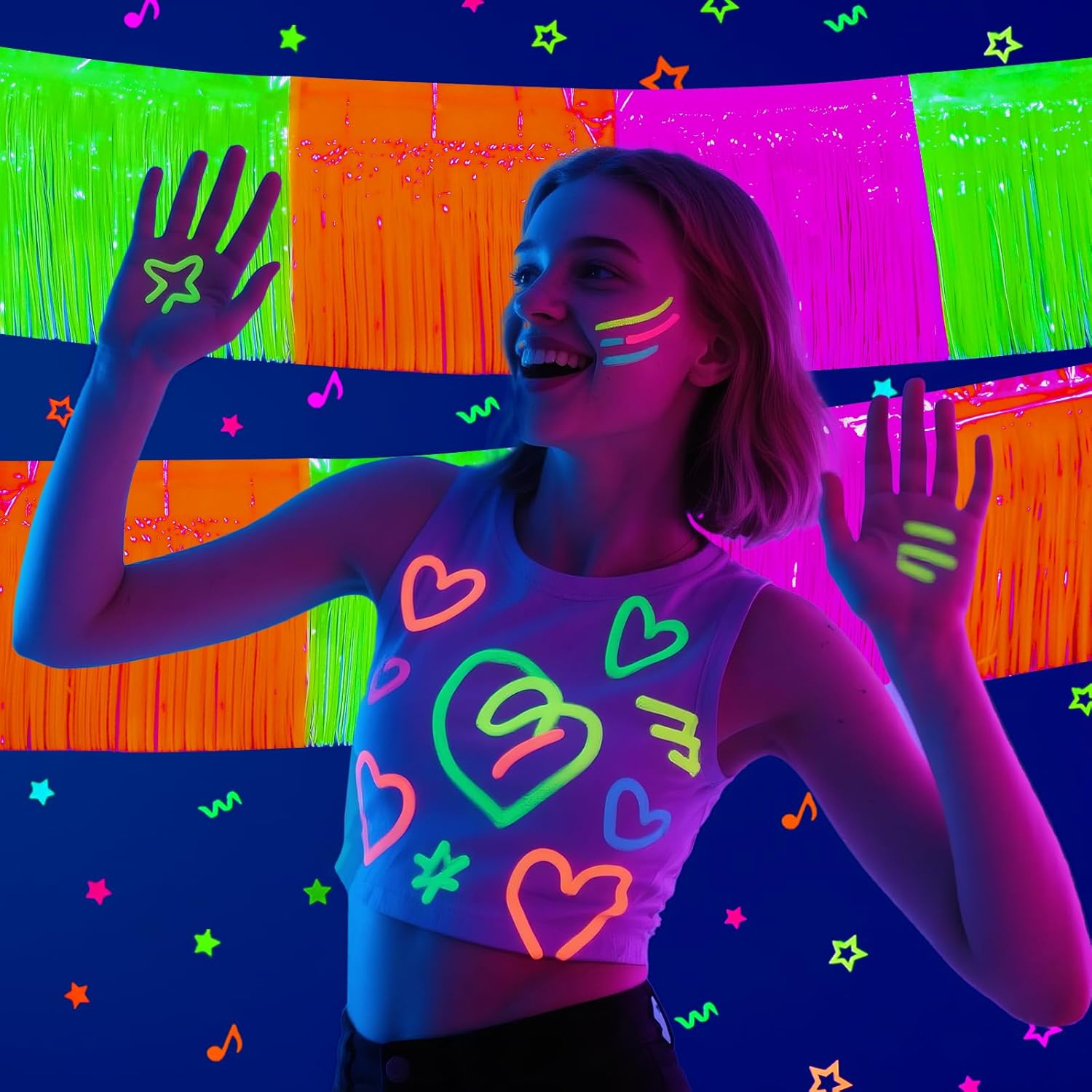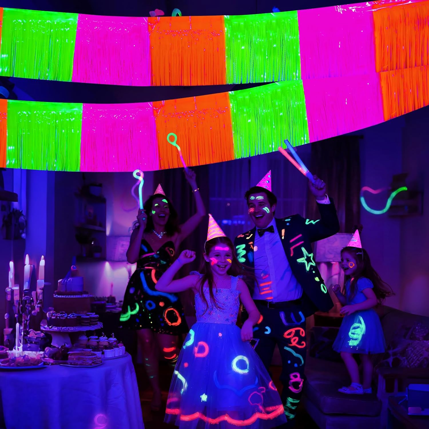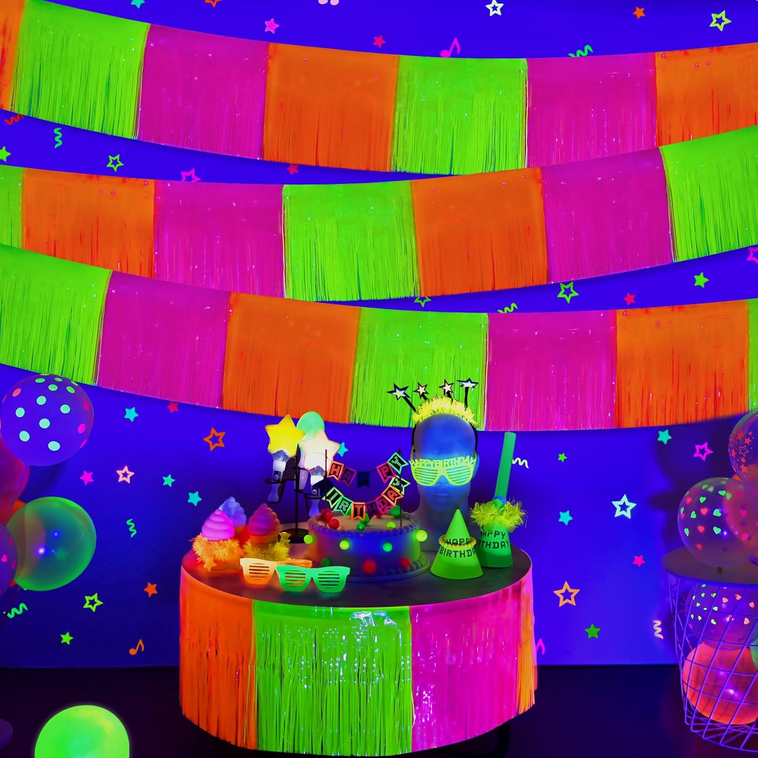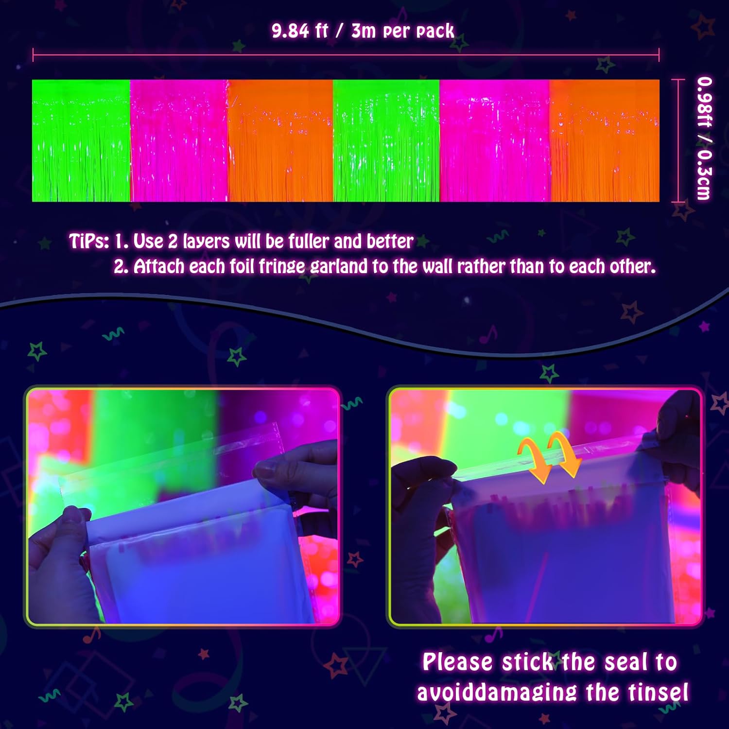 - 【 WIDELY APPLICATIONS】: These Glow In The Dark Neon foil fringe Garland are perfect for neon birthday party, live streamer backdrop, dessert table backdrop, stage backdrop, disco backdrop, bar backdrop, office backdrop decoration, home decoration, pride party decorations, classroom decorations, etc.