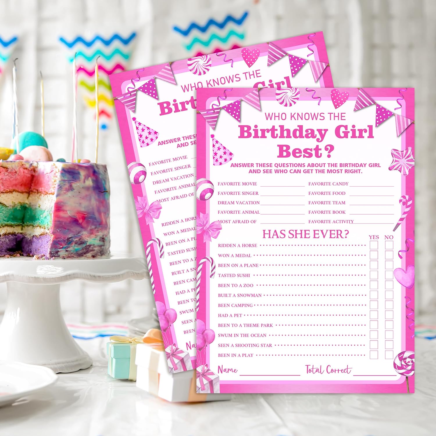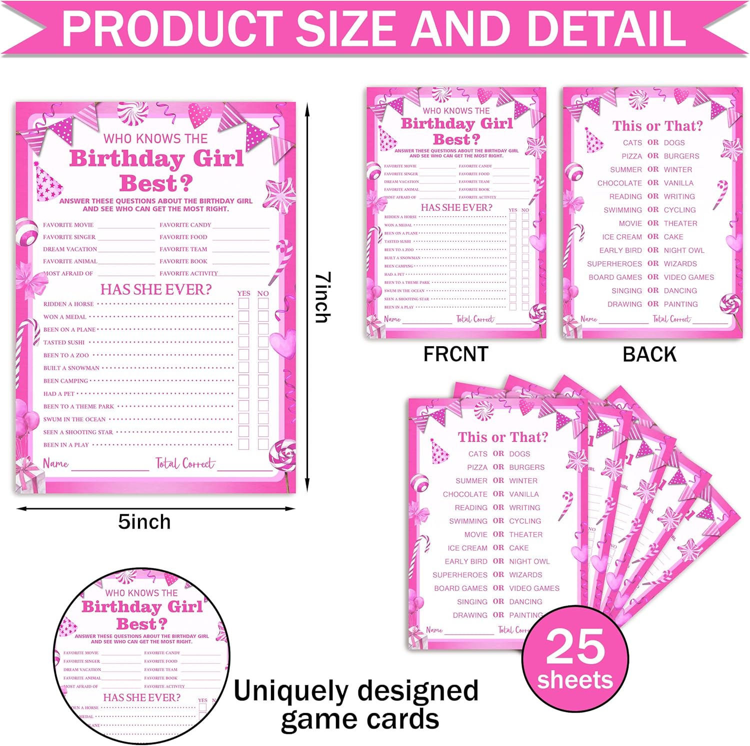 Birthday Party Games Card, Who Knows The Birthday Girl Best, Girls Sleepover Party Supplies for The Girls Card Game, 5x7 Inch Set of 25 Game Cards (Pink, Double-Sided) - A03