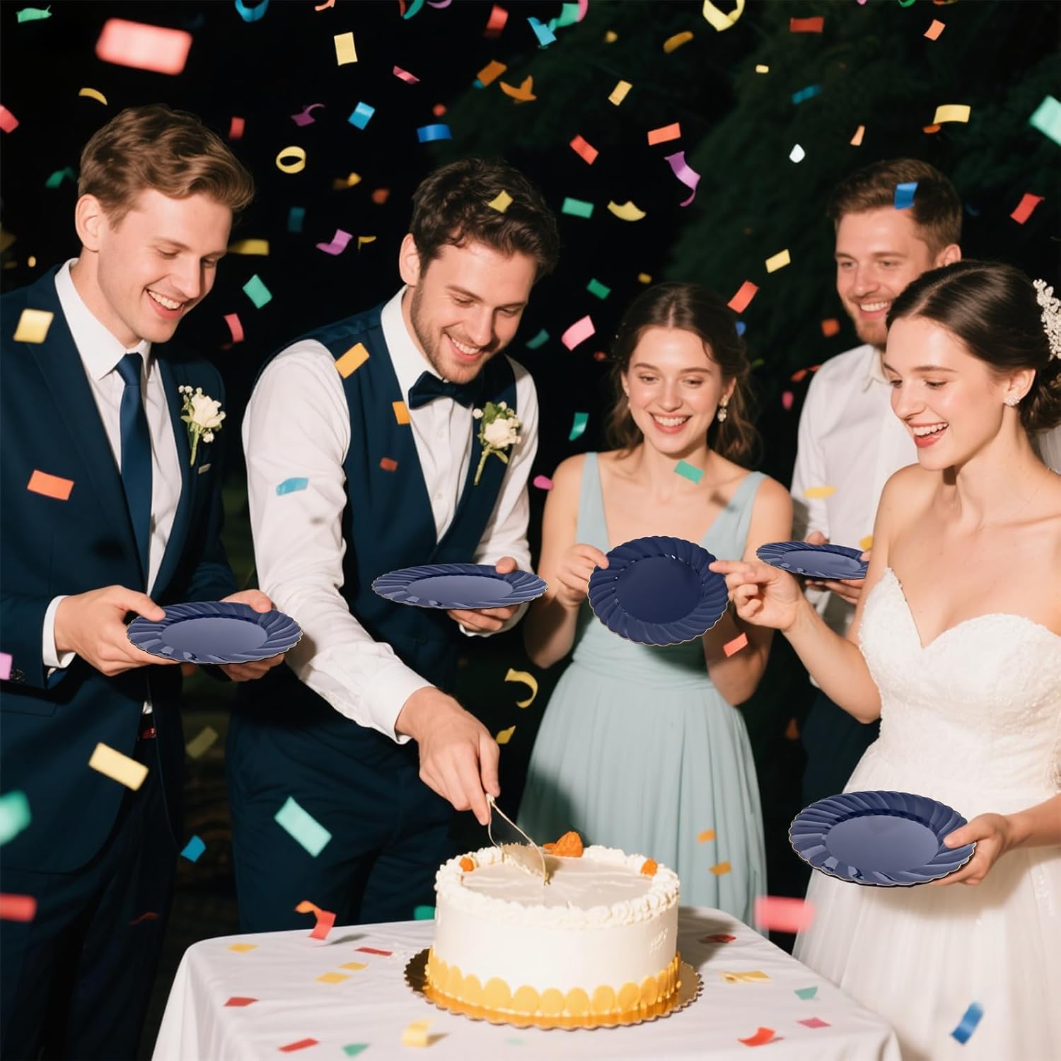 YOUBET 100 Pack Blue Scalloped Plastic Plates - 6.5 Inch Navy Blue Disposable Plates - High End Elegant Vintage Dessert Plate for Party & Weeding & Birthday