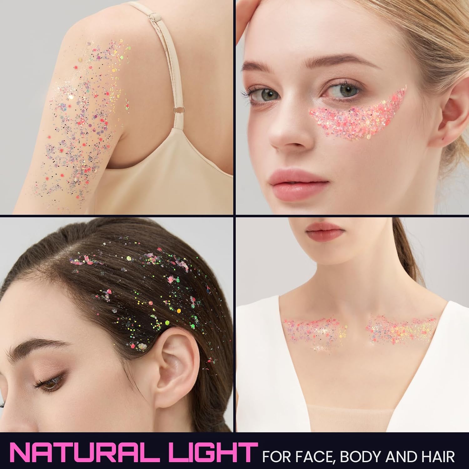 - Effortless Application & Removal Pink Face Glitter: Apply seamlessly with fingers, brush, or sponge, no glue needed. The glow in the dark glitter gel is easy to apply and it has a lightweight feel on skin. Non-sticky after drying and washes off easily with water or makeup remover