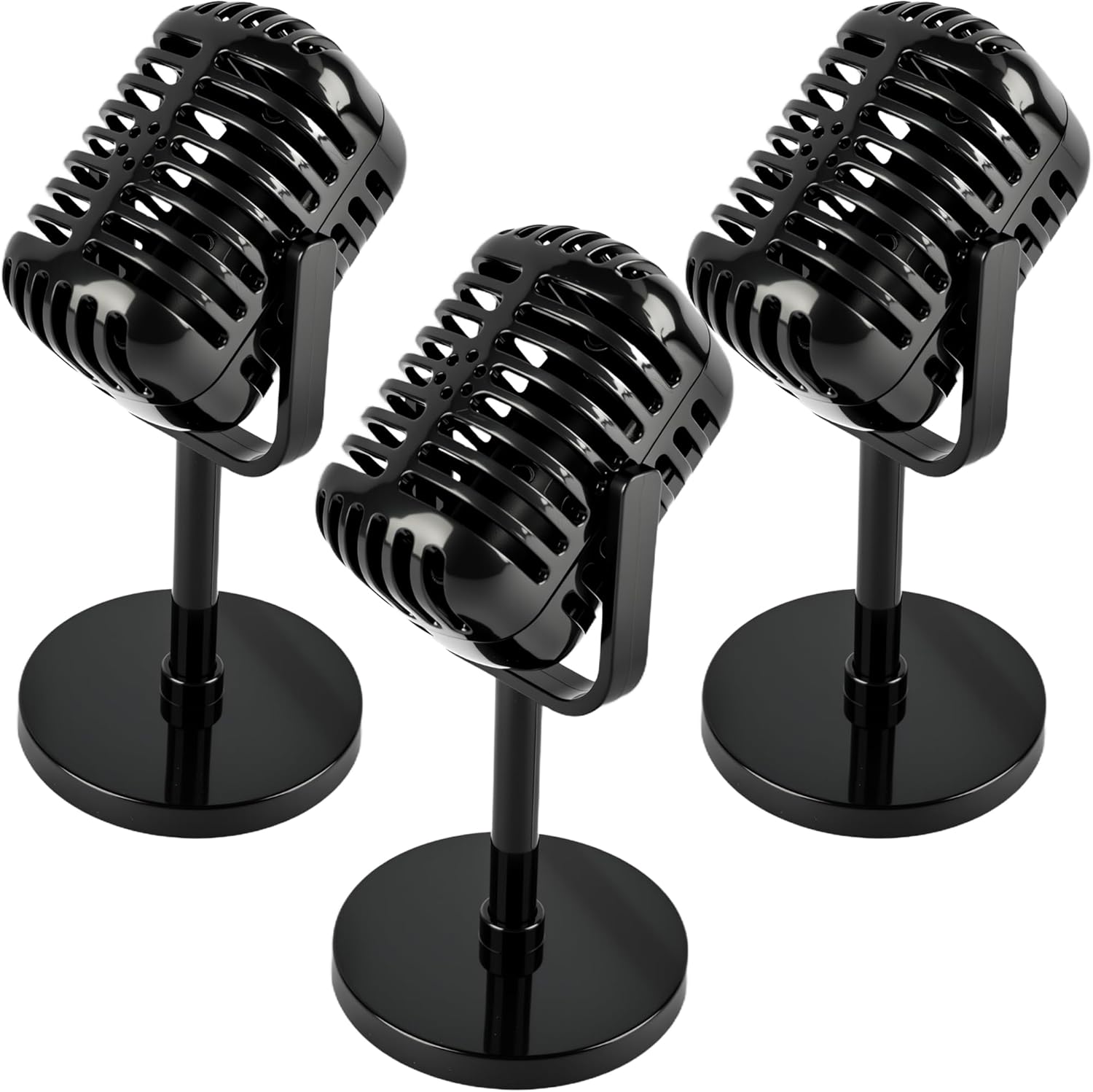 3 Pack Retro Microphone Props Model with Stand Plastic Fake Antique Microphone Stage Table Decor for Classic Party Decoration Costume Prop Pretend Play (Black)