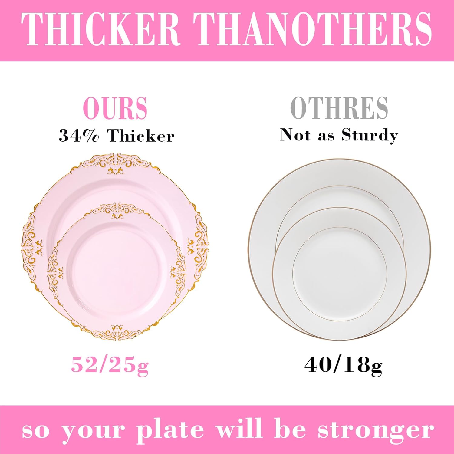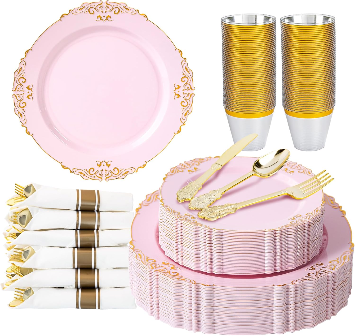 350pcs Gold Retro Dinnerware Sets Disposable, 50 Guests Heavy Duty Plastic Cutlery Sets, 100 Disposable Plates, 150 Silverware, 50 Cups, 50 Napkins for Wedding & Party, Pink