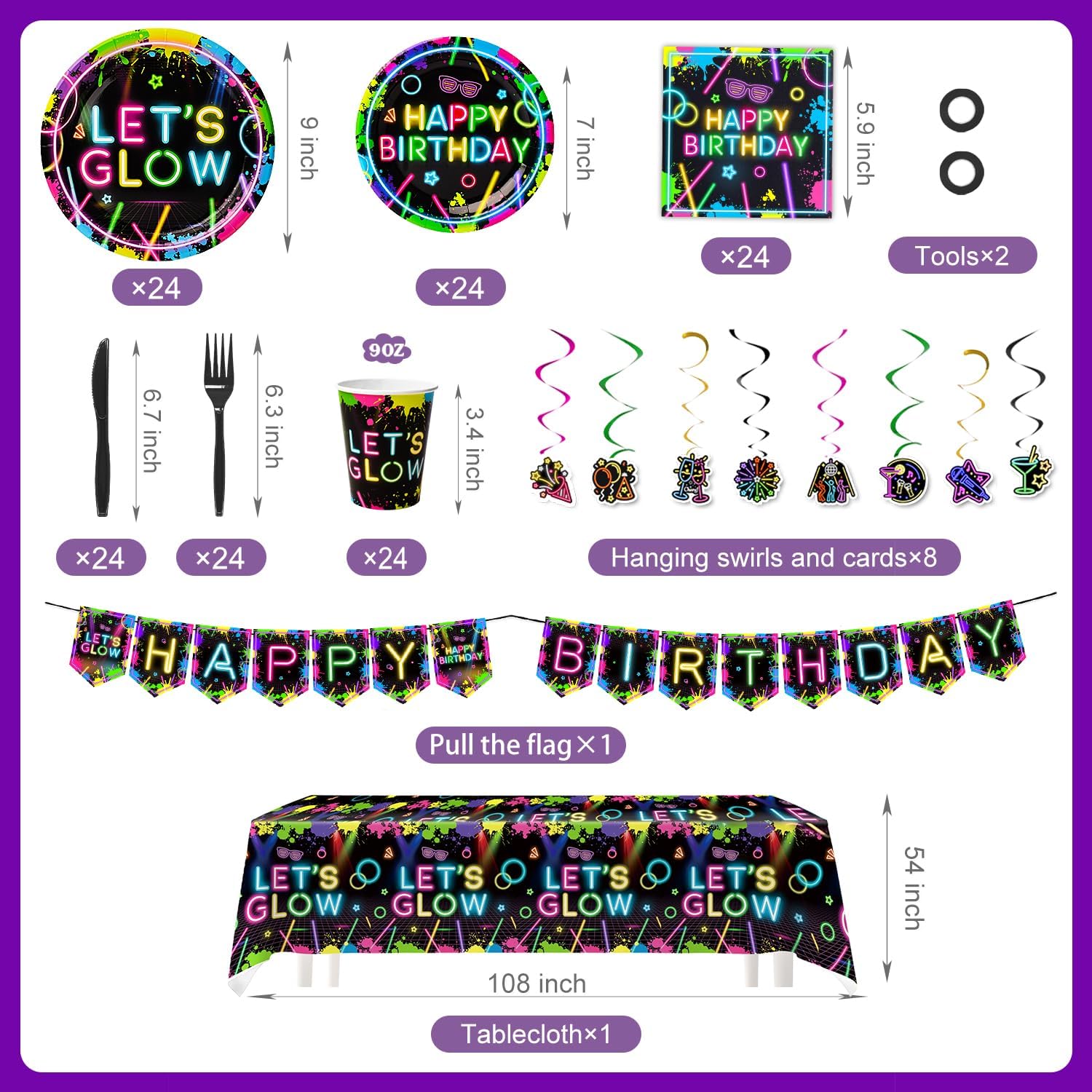 154Pcs Neon Party Supplies Set - Serves 24, Glow in the Dark Party Supplies, Includes Plates, Napkins, Banner, Hanging Swirls, Cups, Cutlery, Tablecloth for Glow Birthday Decorations