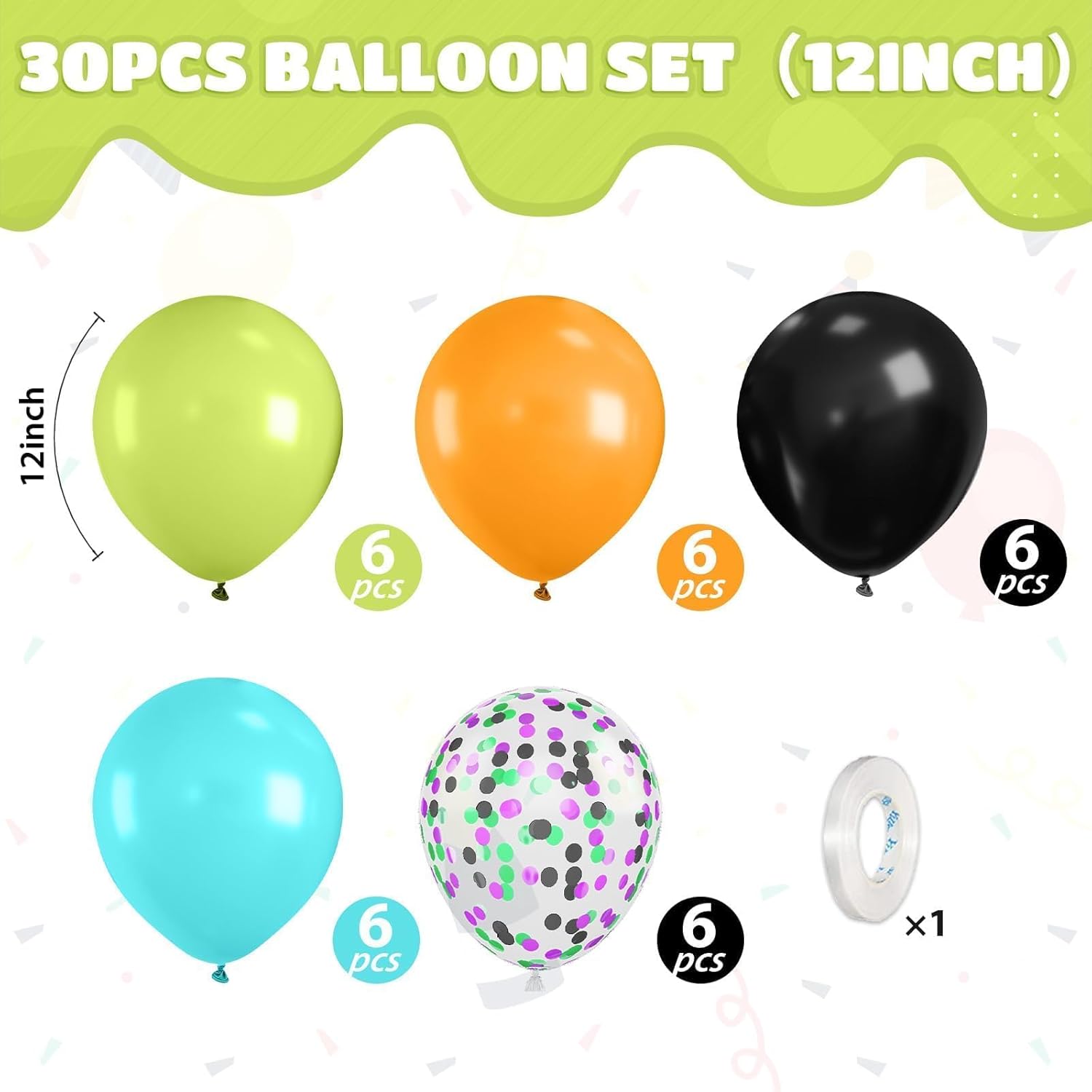 - 【12 Inch Green Orange Black Balloons Balloons Set】Fruit green balloons (6 pcs),orange balloons (6 pcs),black balloons (6 pcs),teal balloons (6 pcs),colorful confetti balloons (6 pcs),white balloon ribbon (1 roll), 30pcs in our green orange black balloon set. Suitable for decorating various occasions, such as boys party birthday baby shower anniversary graduation.