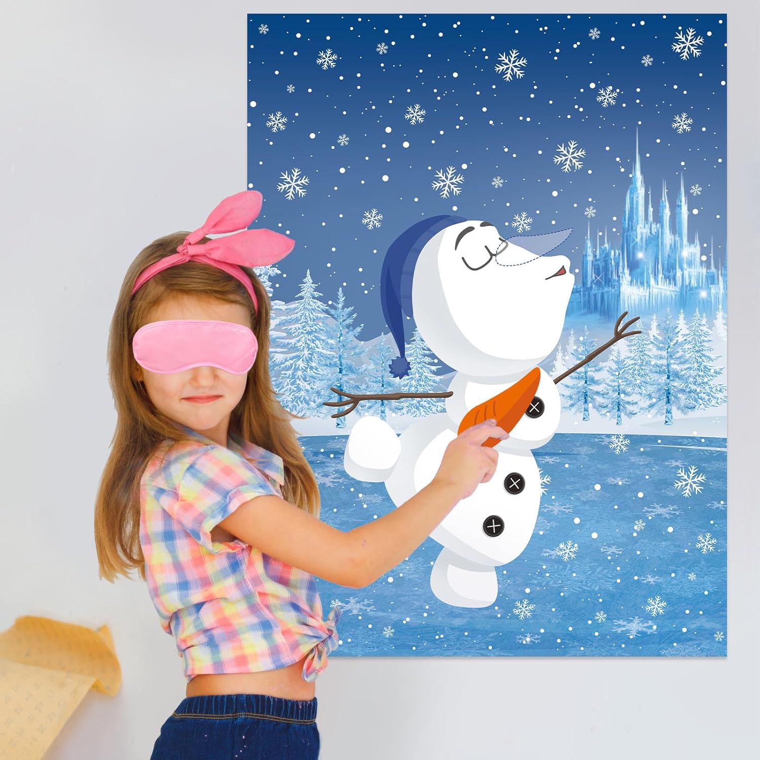 - 【Easy to Play】Put the poster on the wall with glue dots, then take turns to put on a blindfold, take a nose and pin it on the snowman, and the one who stick most accurately is the final winner.