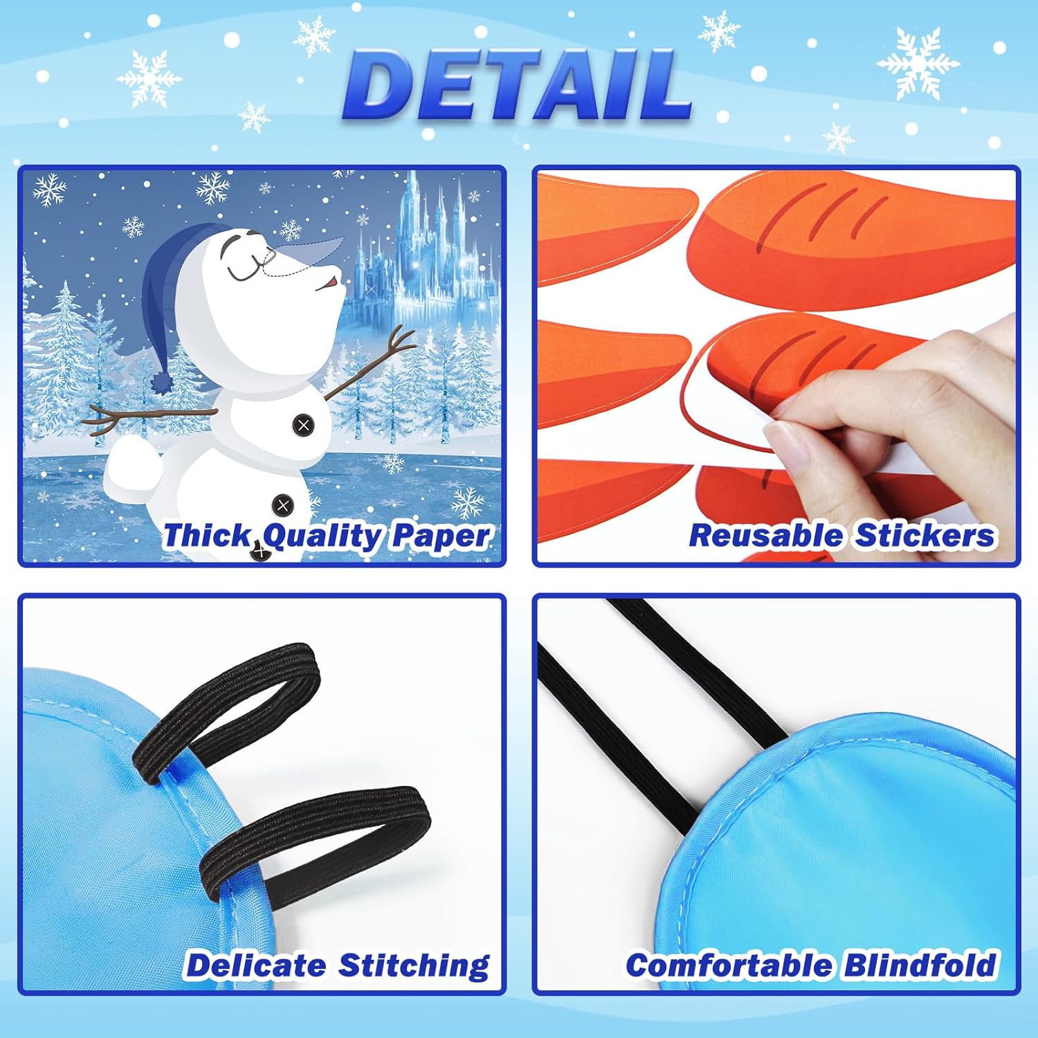 - 【Quality Material】These pin the nose on the snowman party game posters is made of high quality paper, thick and sturdy enough, the stickers are reusable and easy to tear and stick. The eye mask is made of polyester with elastic band.