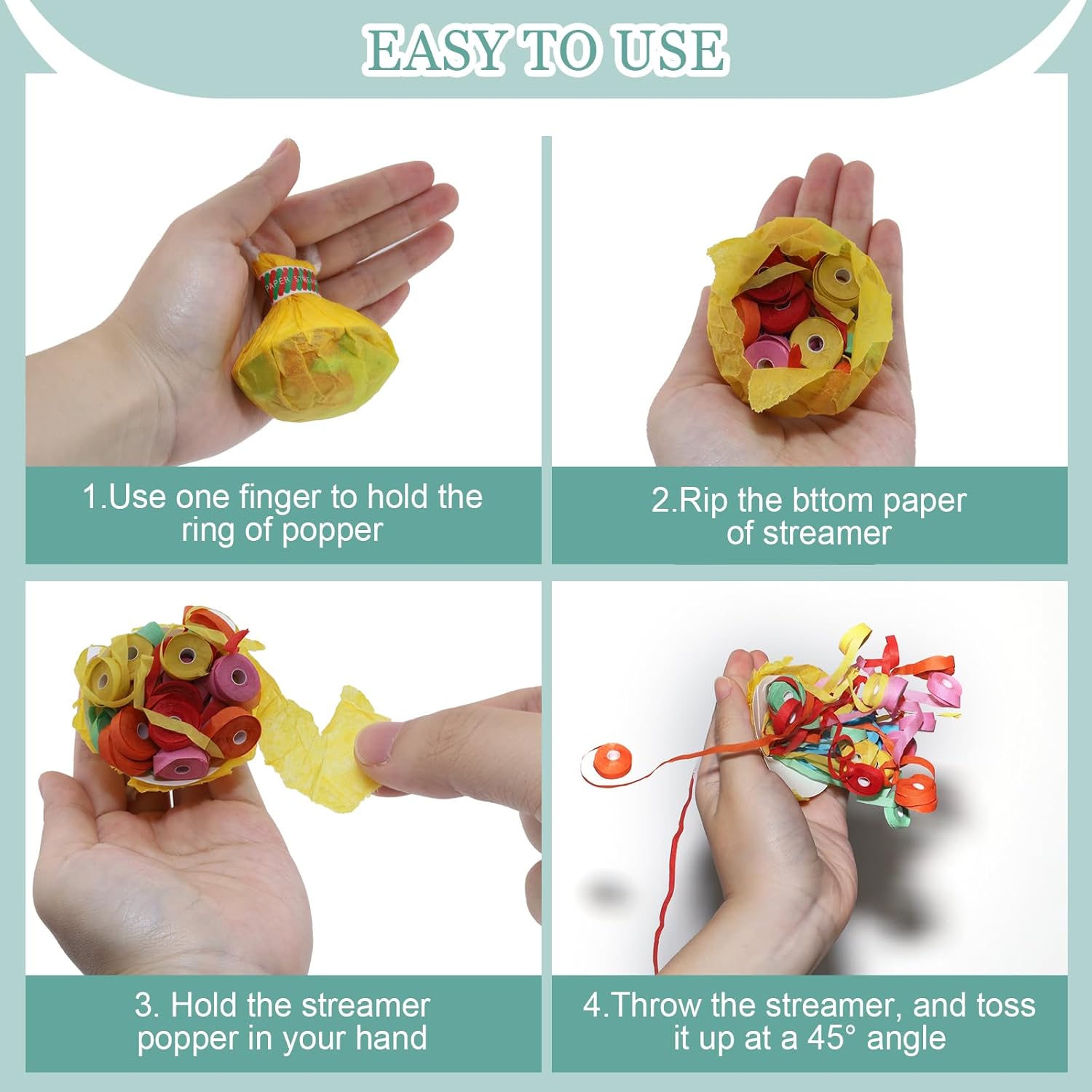 - Easy to Use : holding the popper ring with one finger, then tear the paper in the bottom of streamers,throw it hard into the air.