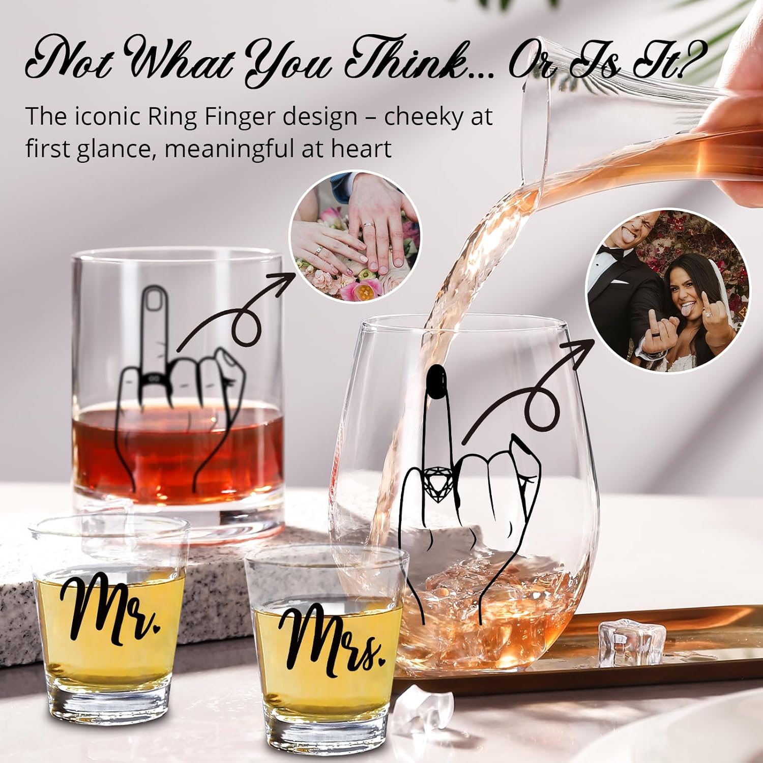 - π All-in-One Engagement Gift Set Includes 1 Ring Finger wine glass, 1 whiskey glass, and 2 shot glasses marked Mr. & Mrs. β A perfect mix of romance and fun for newly engaged couples.