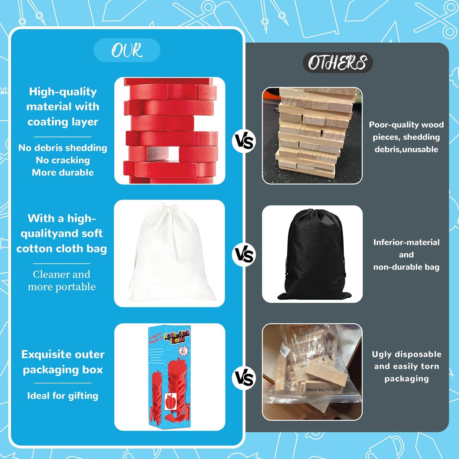 - Boosts Focus & Coordination: This wooden stacking game isn’t just fun—it’s a great way to improve hand-eye coordination, concentration, and patience. The tower balance game encourages friendly competition and strategic thinking.