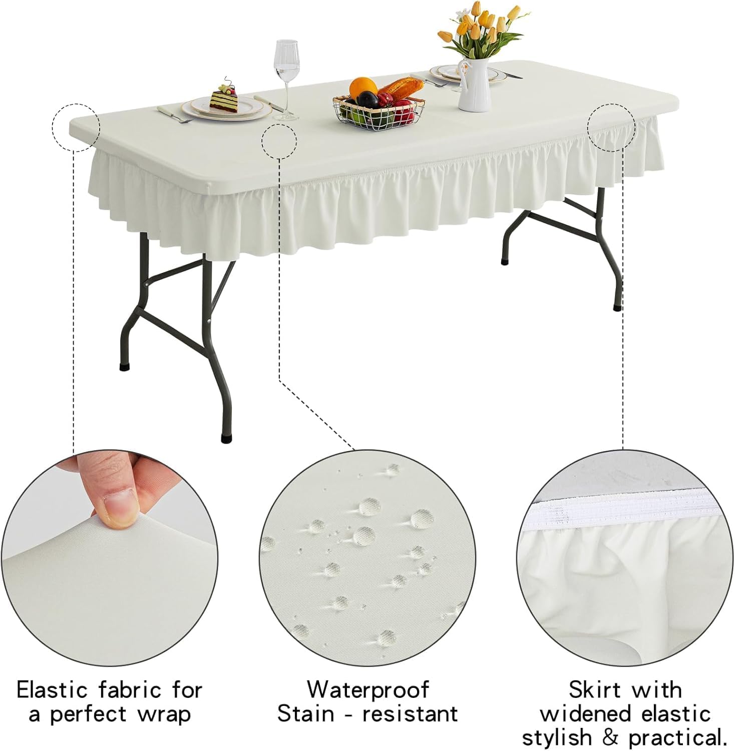 4ft Ivory Stretch Tablecloth for Rectangular Tables - Flared Wrap Design, Waterproof, Wrinkle-Resistant, Washable - Ideal for Weddings, Parties, Banquets & Table Protection