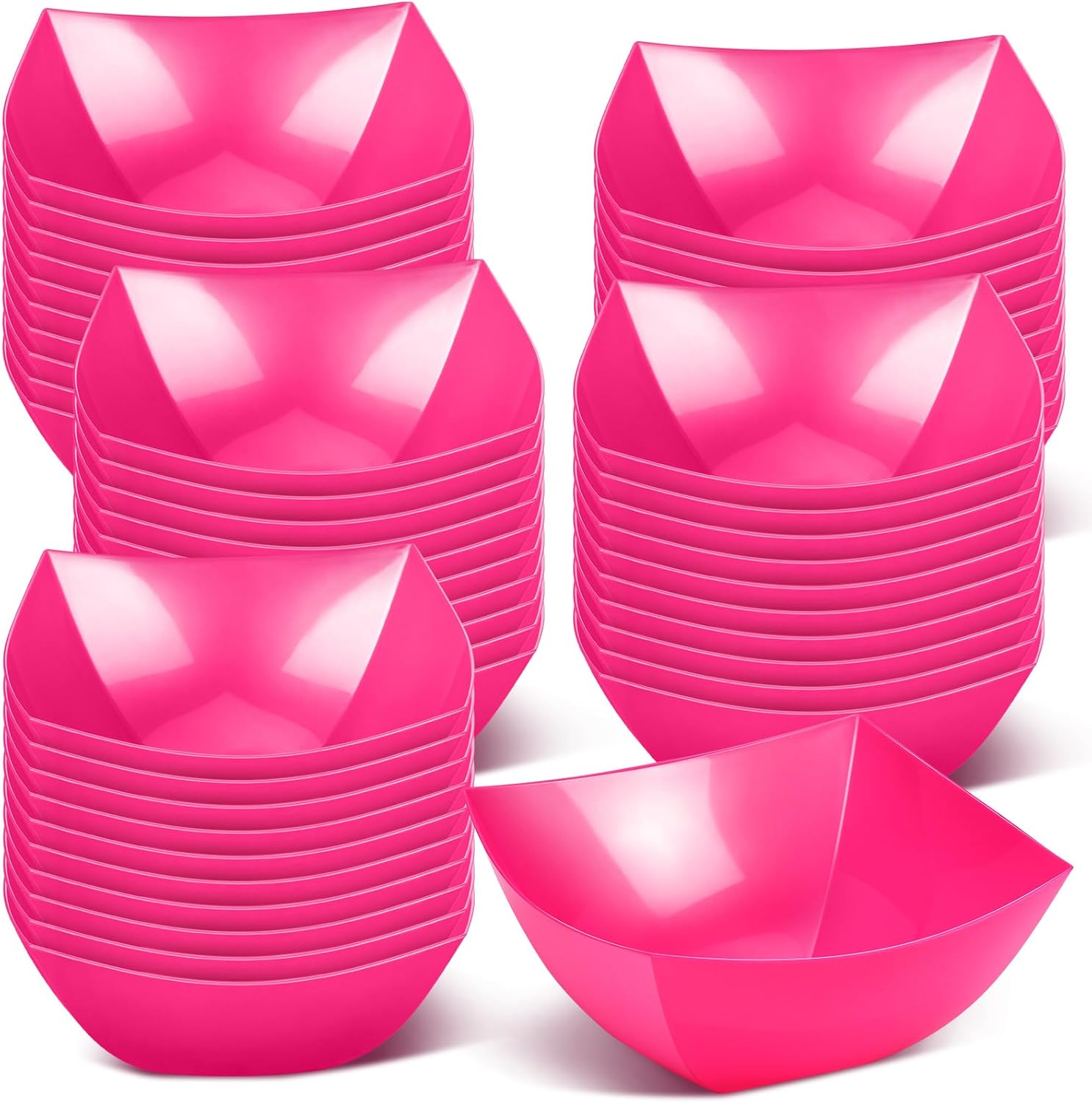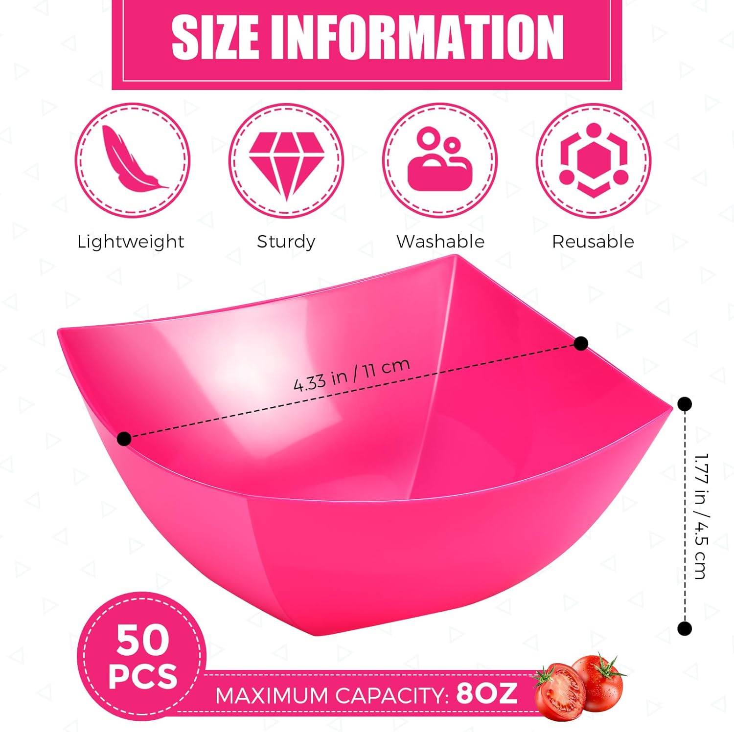 - What You Will Get: you will get 50 pieces of square plastic disposable bowls for parties altogether, available in rose red, 8 ounces, suitable foods include generally snacks, salads, sauces etc; Suitable for parties, family dinners, holidays and so on