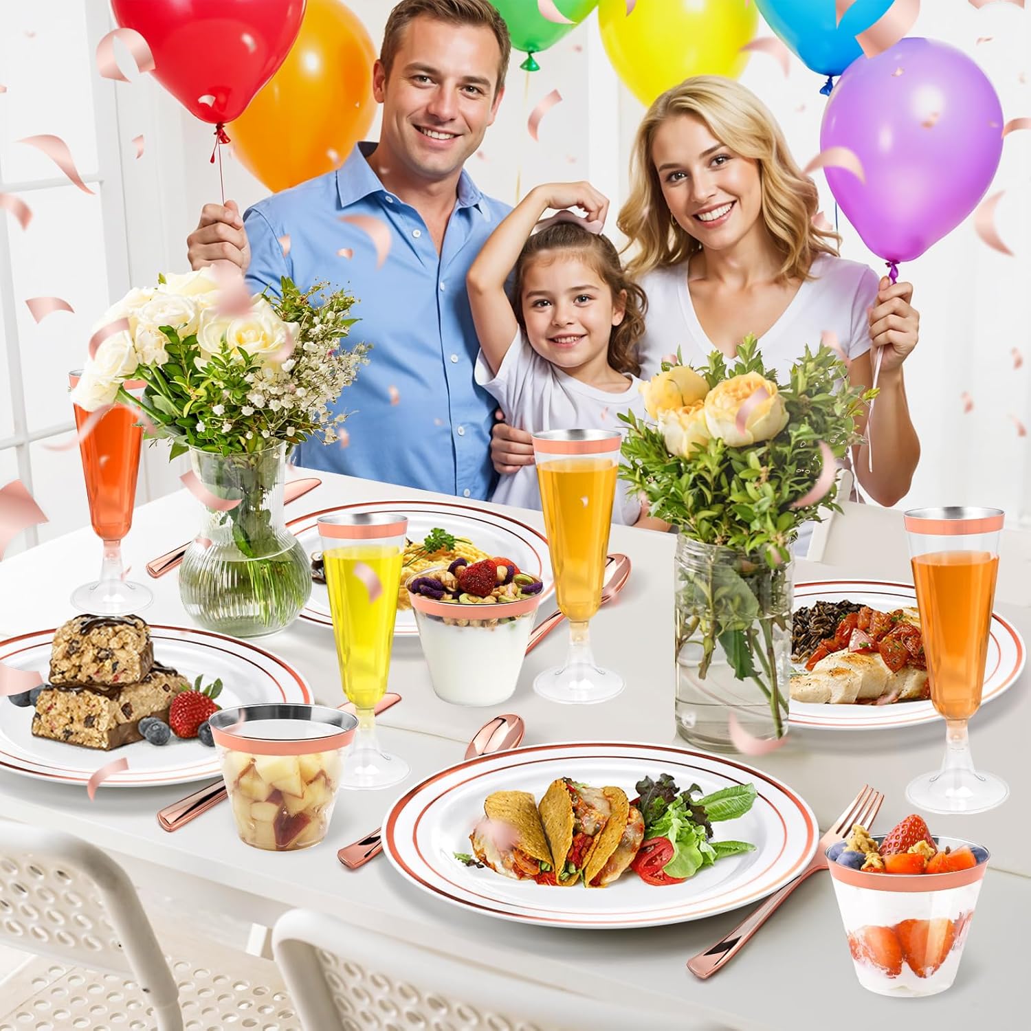 JIURUN 150PCS Rose Gold Plastic Plates Set for 25 Guests, Disposable Dinnerware Set of 25 Dinner, 25 Cups & Champagne Flutes Cups, 25 Spoons, Forks & 25 Knives for Birthday, Wedding & Party Supplies