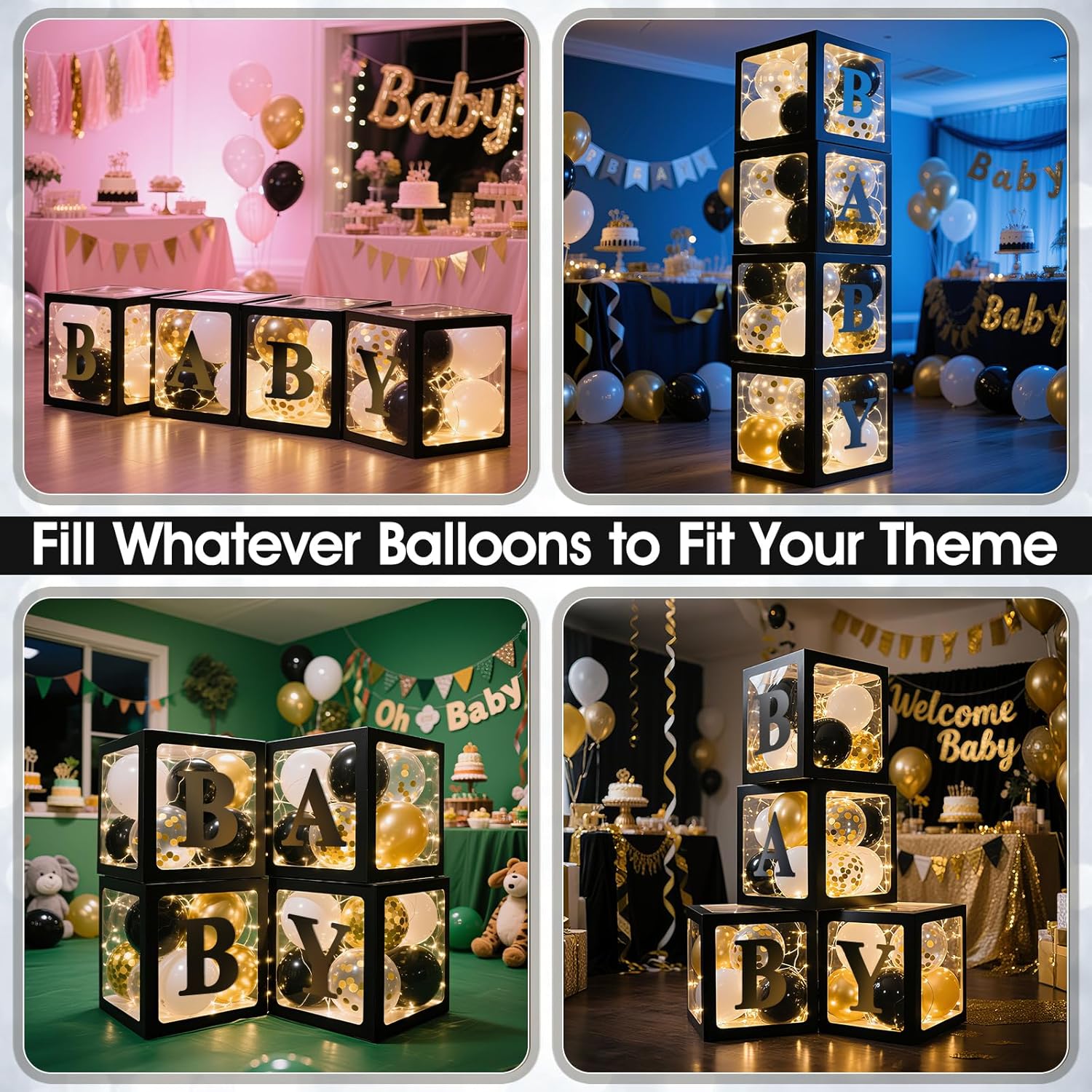 Ledido Baby Boxes with Letters for Baby Shower Decoration, 4 pcs Clear Balloon Boxes Blocks with LED Fairy String Lights 38 Balloons for Boy Girl Gender Reveal Birthday Party (Black)