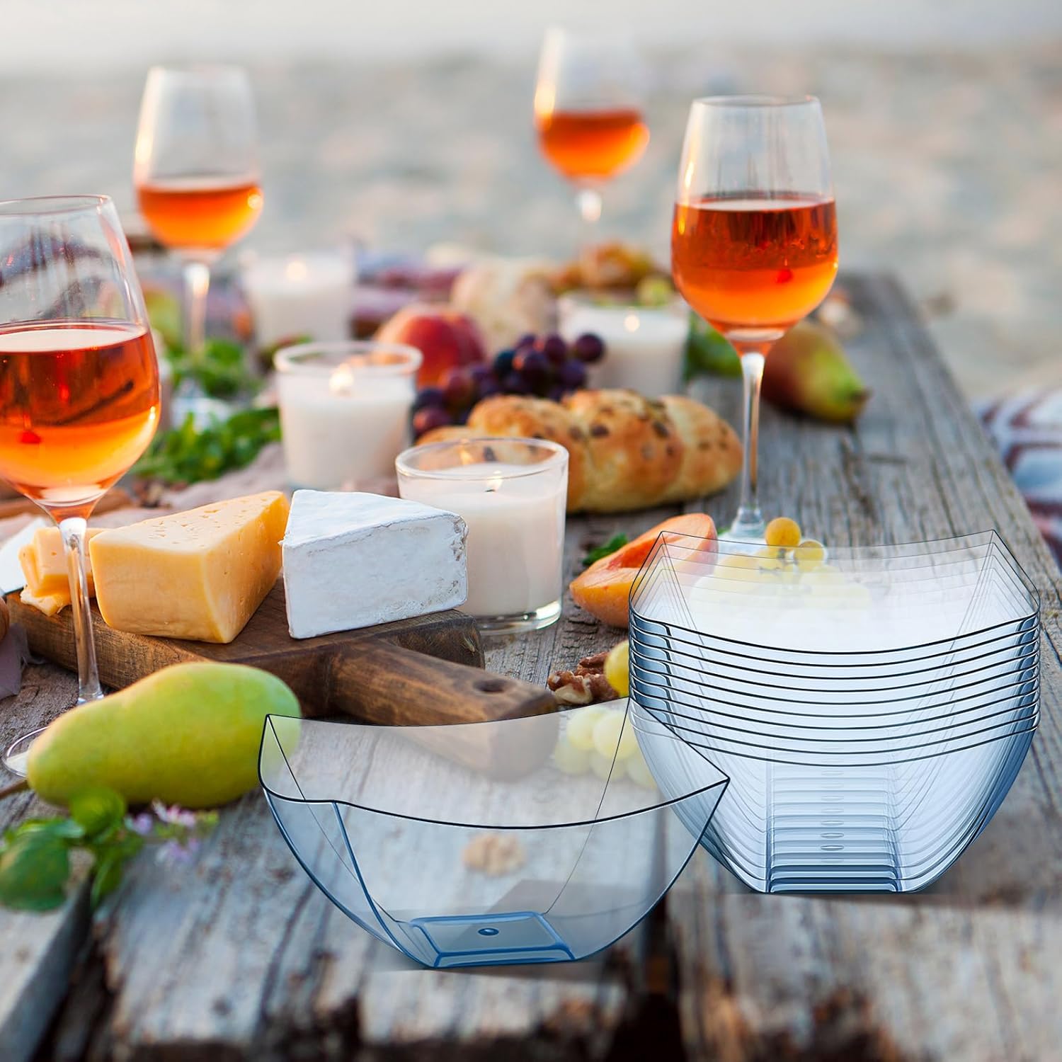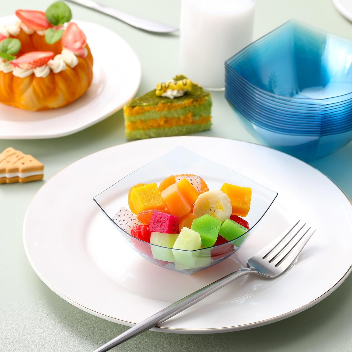 - What You Will Get: you will get 50 pieces of square plastic disposable bowls for parties altogether, available in blue, 8 ounces, suitable foods include generally snacks, salads, sauces etc; Suitable for parties, family dinners, holidays and so on