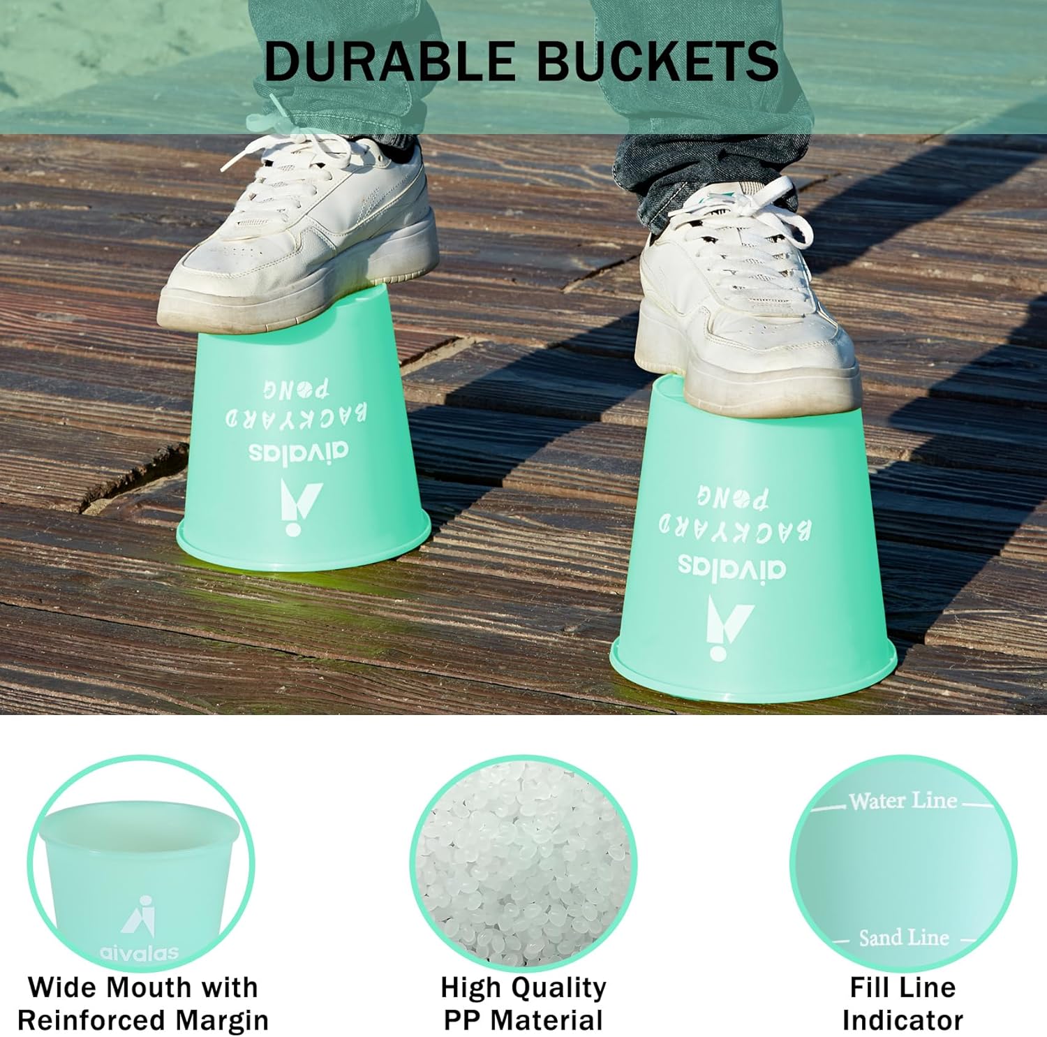 - High Quality:Our yard pong bucket set are made of high-quality, plastic that withstands rough play. Buckets can be weighted with sand/water for stability.Features smooth, burr-free edges for safety and easy cleaning,so that you and your family and friends can play to your heart's content.