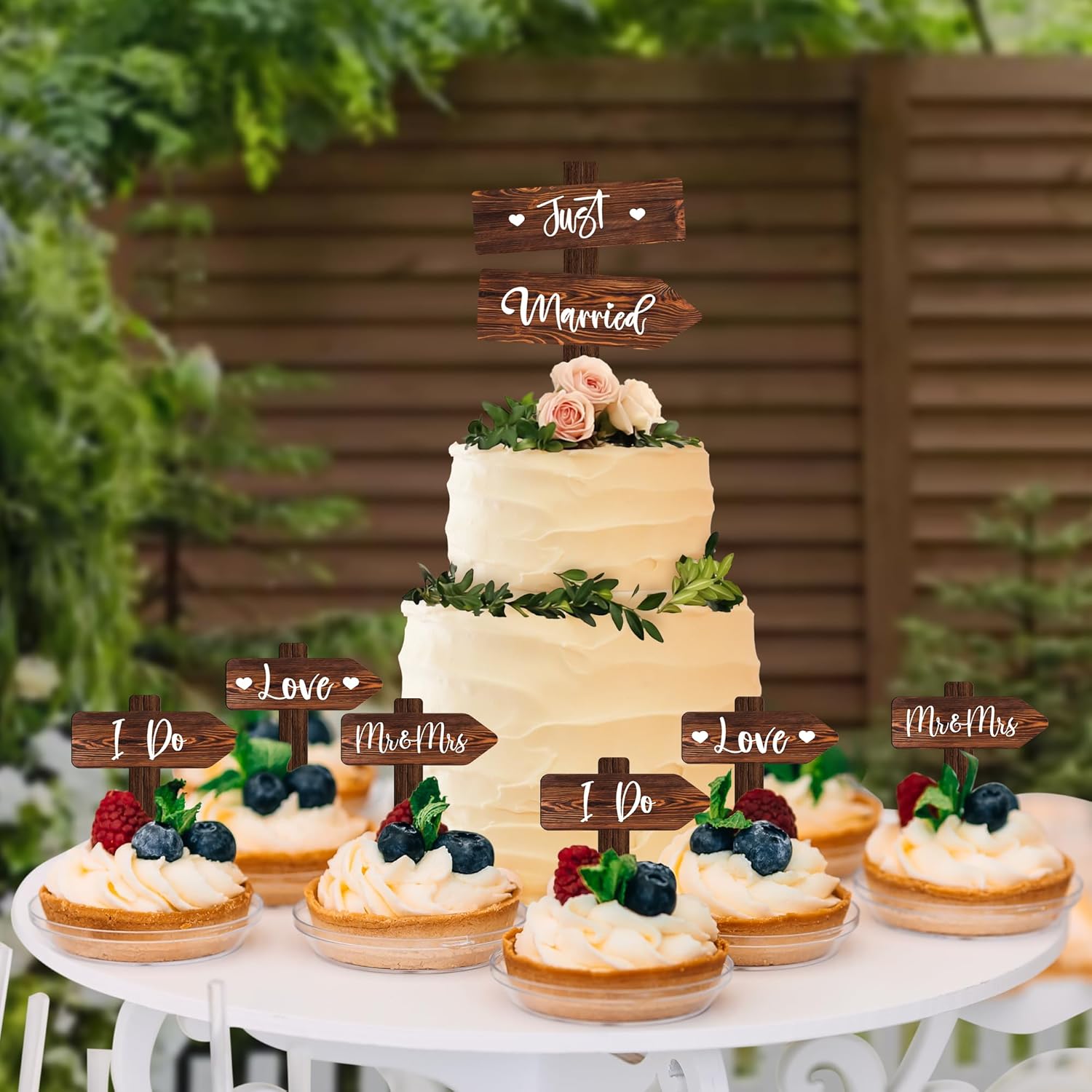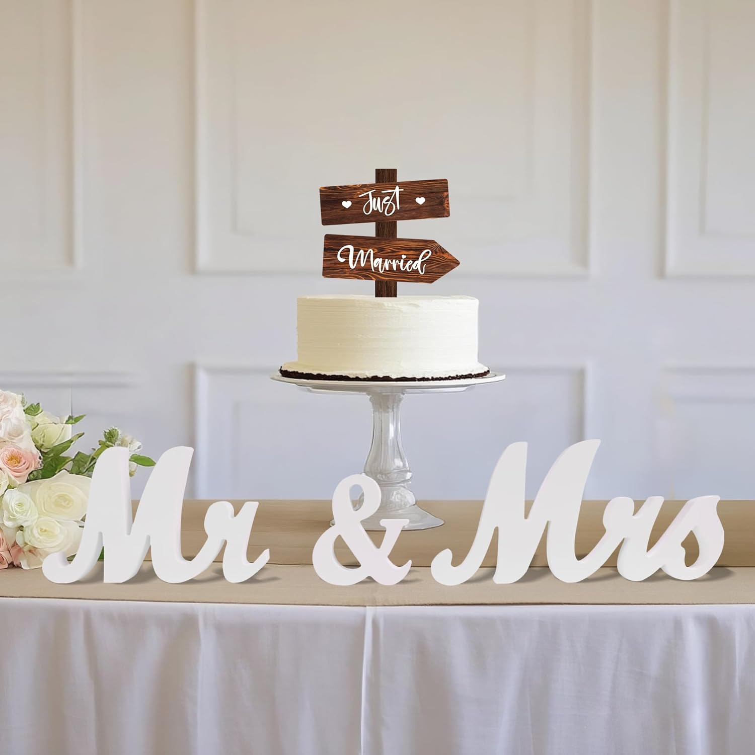 Rustic Wedding Decoration Set Just Married Cake Topper & 12 PCS Cupcake Toppers & Banner & Mr Mrs Table Sign in Wood