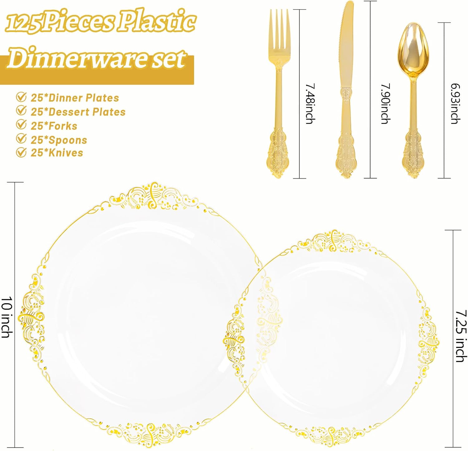 - Value Package: The clear plastic plates with gold trim include 25 clear dinner plates (10 inches) and 25 clear dessert plates (7.25 inches), paired with 75 pieces of gold silverware disposable sets for a complete dining experience