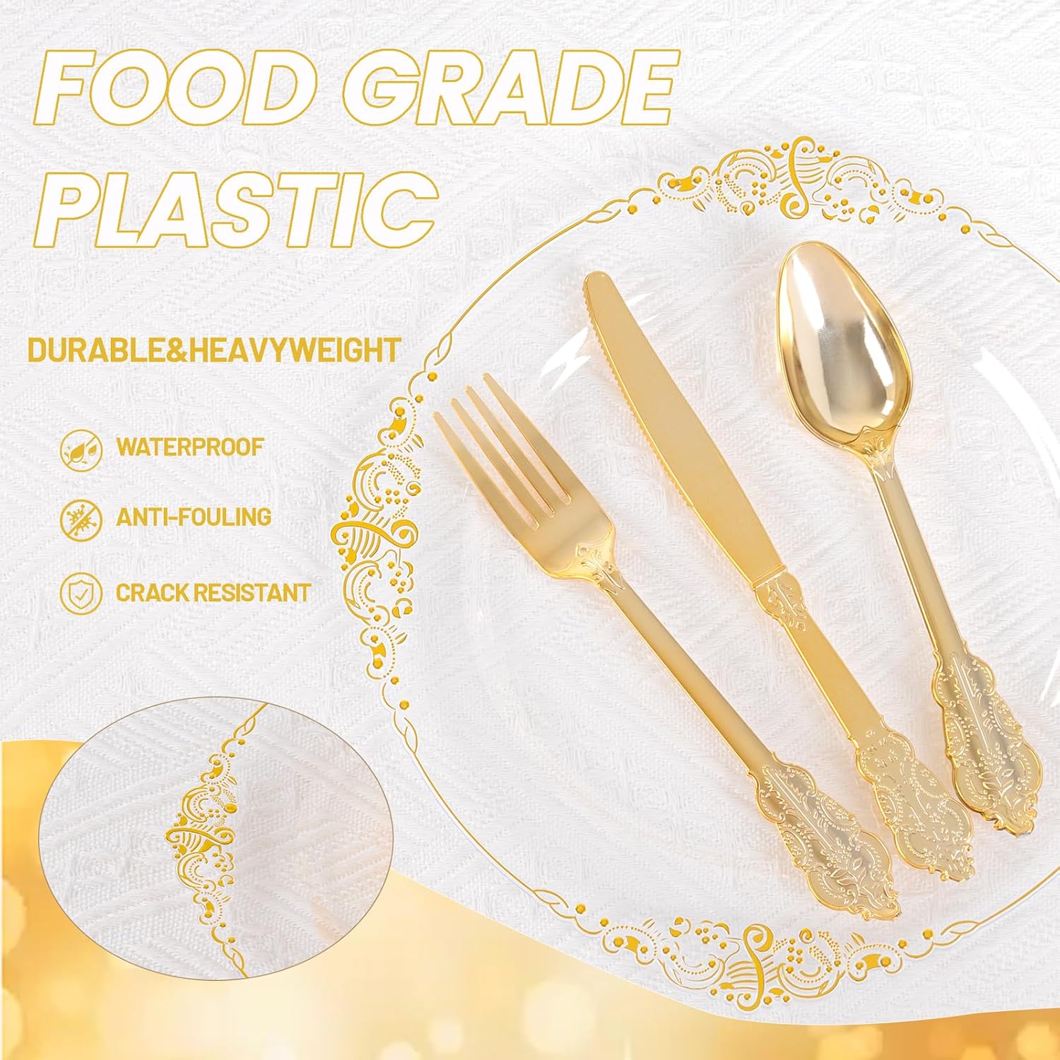 - Versatile for All Occasions: The fancy plastic dinnerware sets are perfect for any event, from casual gatherings to formal celebrations. The elegant plastic plates with gold silverware disposable are versatile enough to complement any theme, making them a must-have for any host