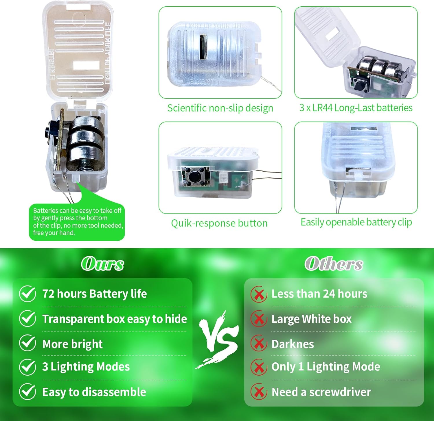 - PREMIUM QUALITY AND LONG LAST LIFE: 8-100 pack in a box, each twinkle lights made of high quality durable 7 feet long flexible silver wire, and 20 energy-efficient mini led fairy lights, 4 inch distance between each led moon lights. This fairy lights battery operated by 3 x LR44 batteries (included), which can provide 90 hours life. This Christmas lights is perfect for both everyday decorations as well as holiday decor (Batteries need to be replaced when the string get dims)