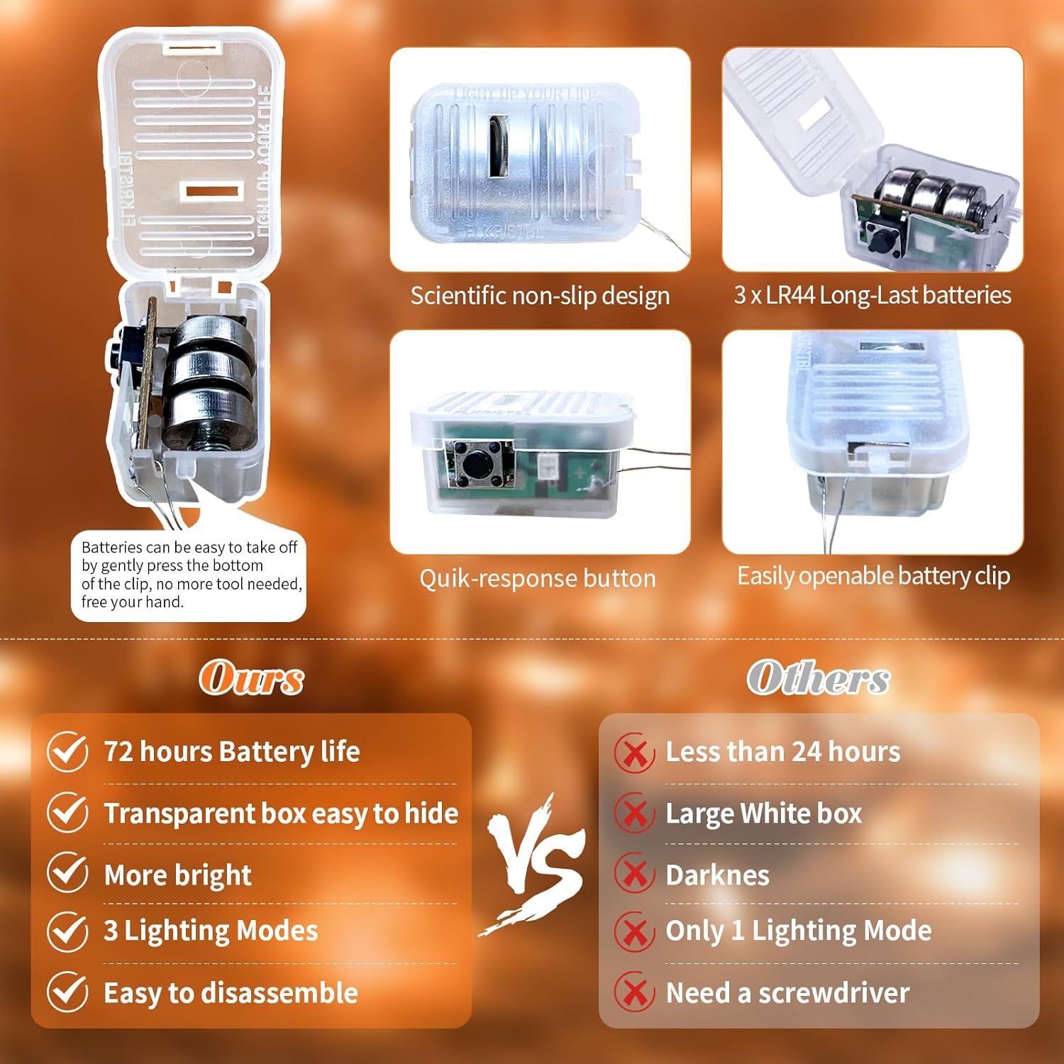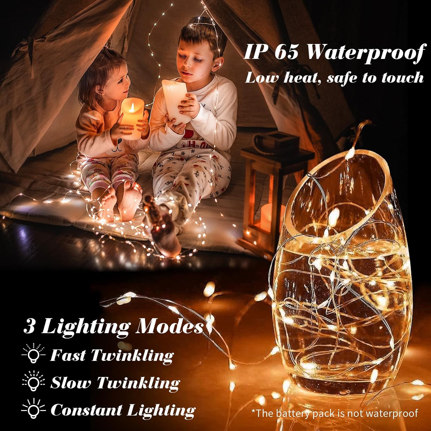 - 3 LIGHTING MODES AND WAIDELY APPLICATION: The fairy lights are super convenient enables to switch 3 flashing modes, Fast Twinkling, Slow Twinkling and Constant Lighting; This versatile battery operated lights can be used for Christmas decoration, holiday, Halloween parties, Valentine's Day, wedding, bedroom and centerpiece table decorations. Giving you different decorative effect and romantic atmosphere