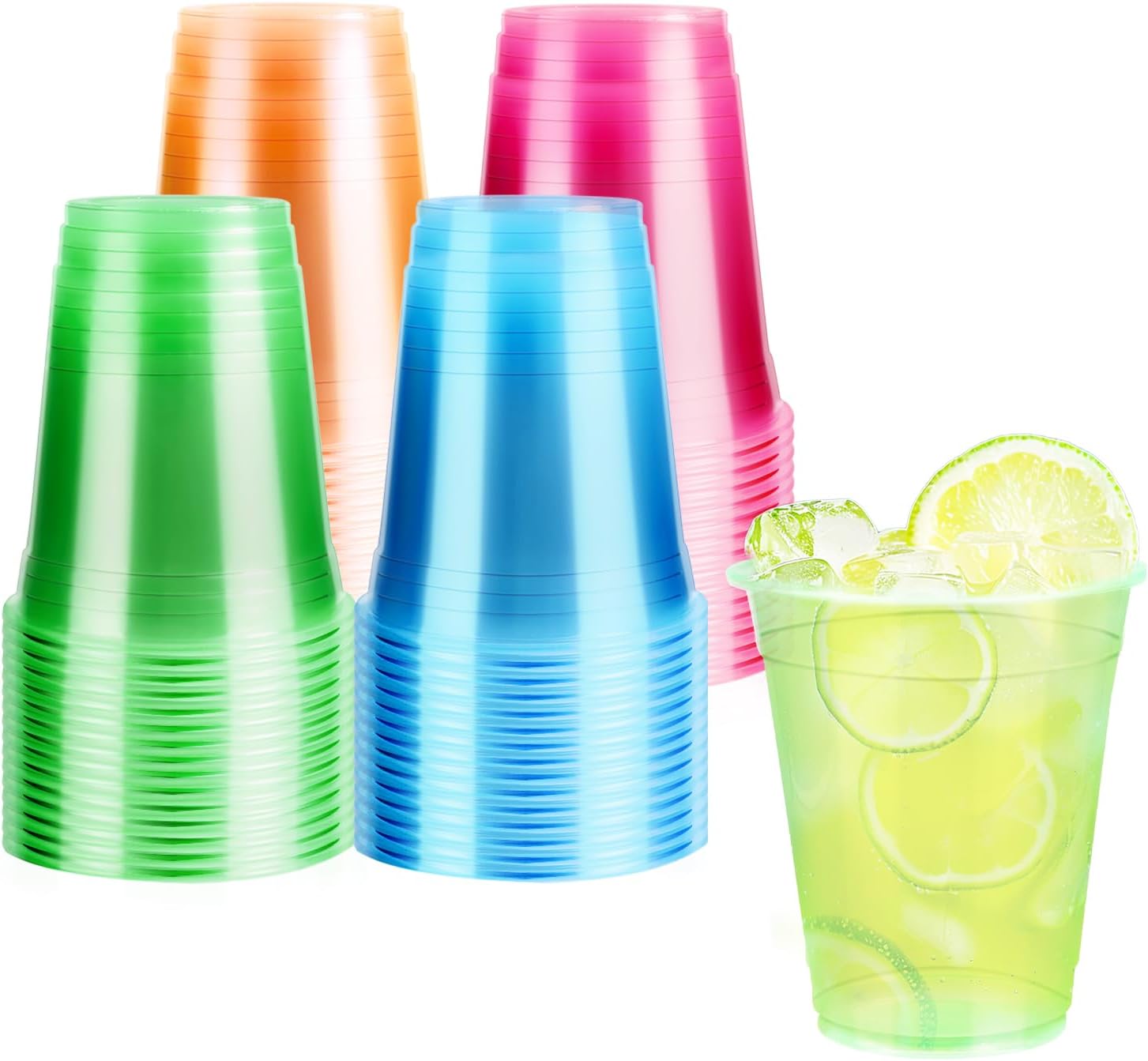 - Package: Our neon cups come in a bulk set of 60 cups, featuring 4 colors (pink, orange, green, and blue — 15 cups of each color);this pack ensures you have enough disposable cups for large gatherings