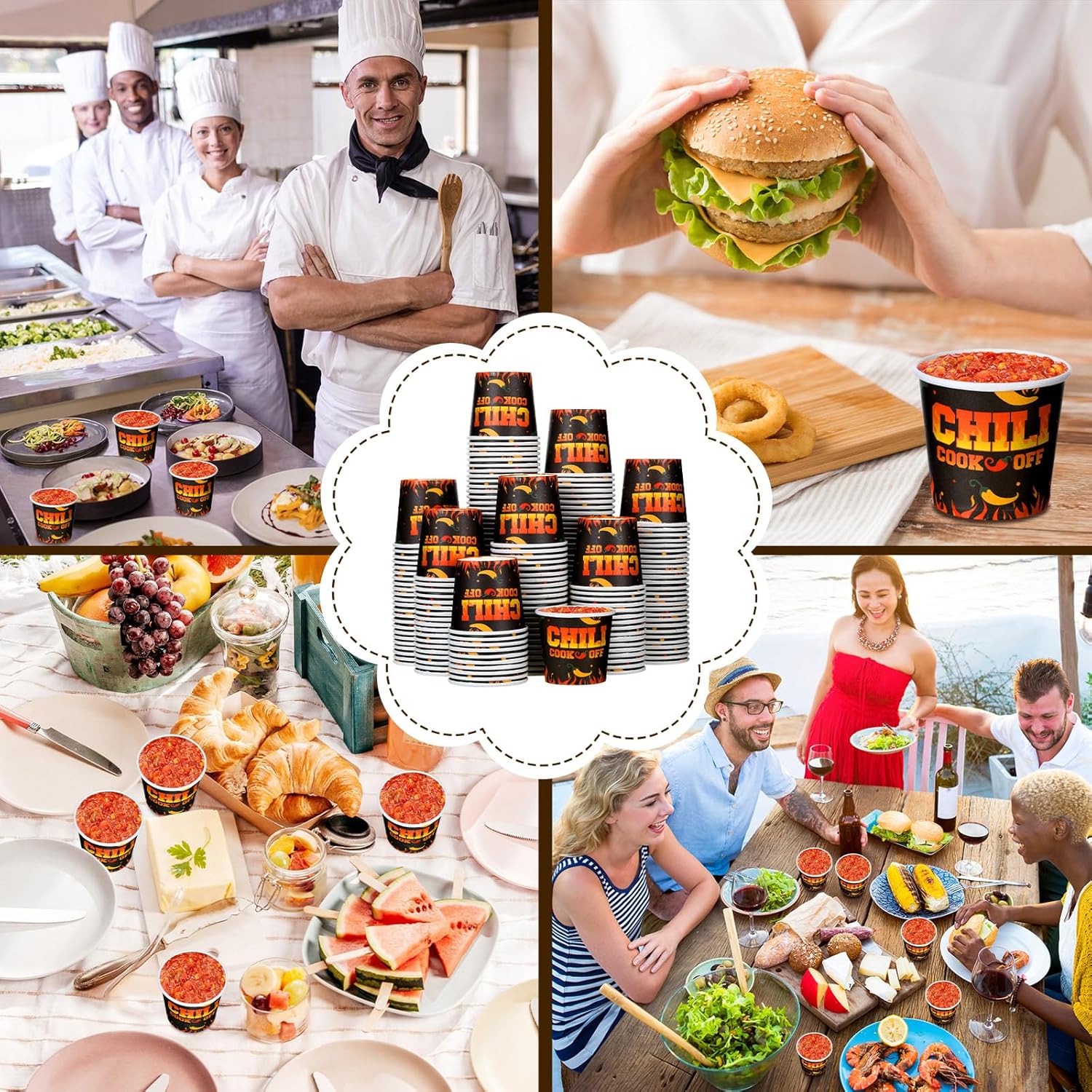 - Quality Material and Conveniently Sized: the convenient size of our 4 oz disposable paper cups, 4oz capacity is about the size of a tennis ball, these mini chili cooks off cups made from reliable paper; Whether it's chili, condiments, sauces, or dips, trust these cups to hold it all without leakage; Experience nice strength, so that your party runs smoothly