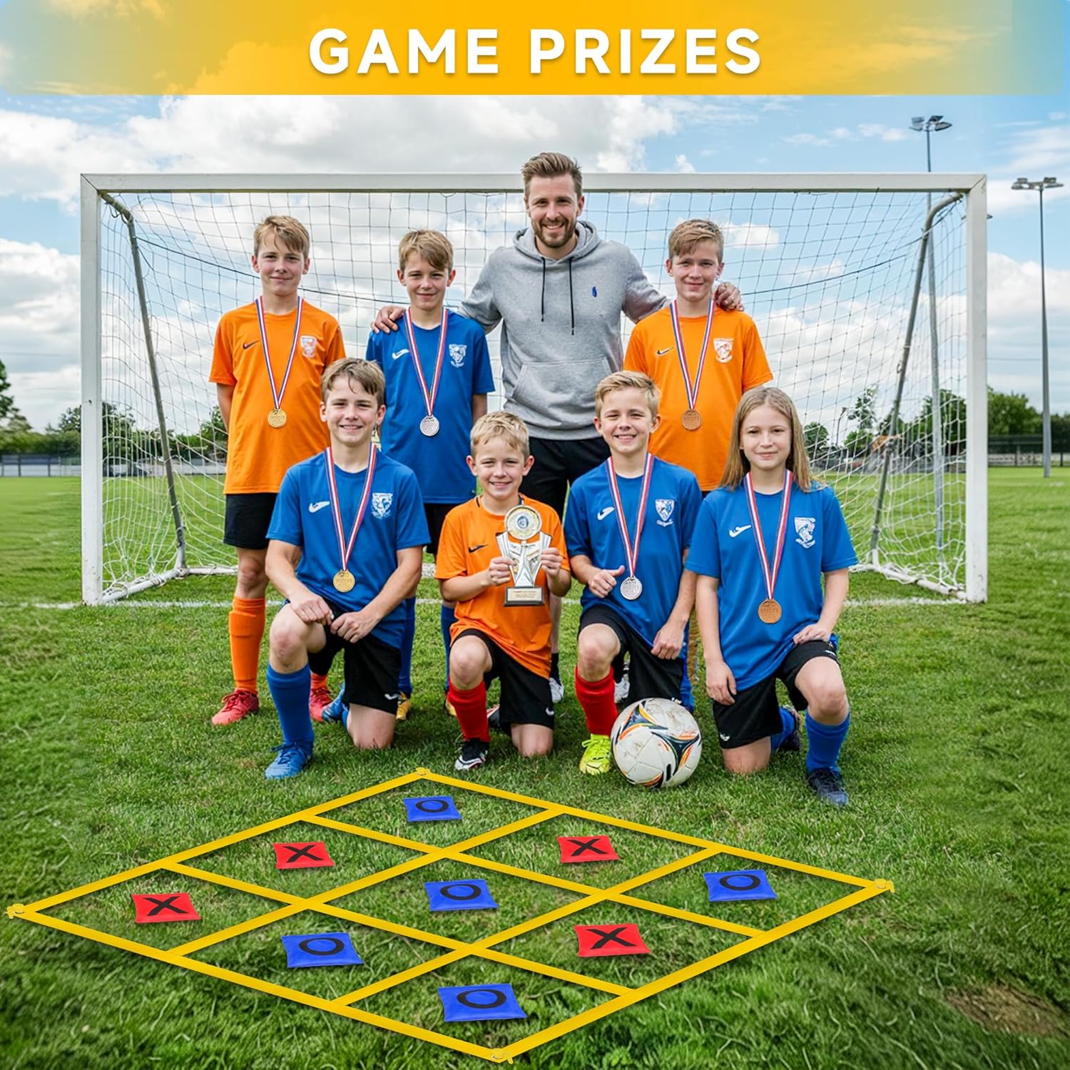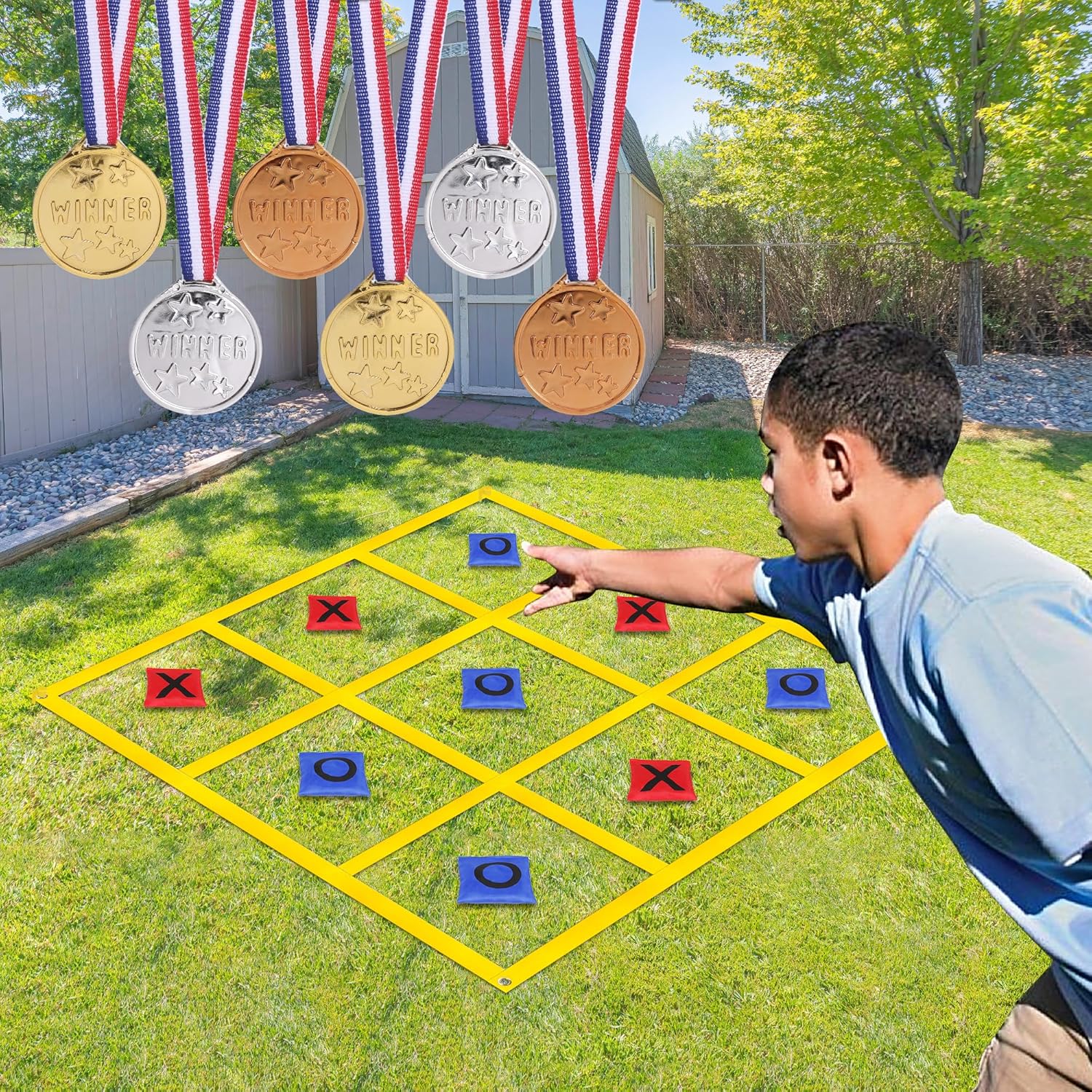 - 【Easy Set Up】The grid is made with 4-foot sturdy nylon straps and secured in the ground with stakes, allowing for setup in minutes. The bean bags feature lettering (X & O) on both sides, come with 6 pieces of medals, and include a storage bag, making it easy to use and easy to store.