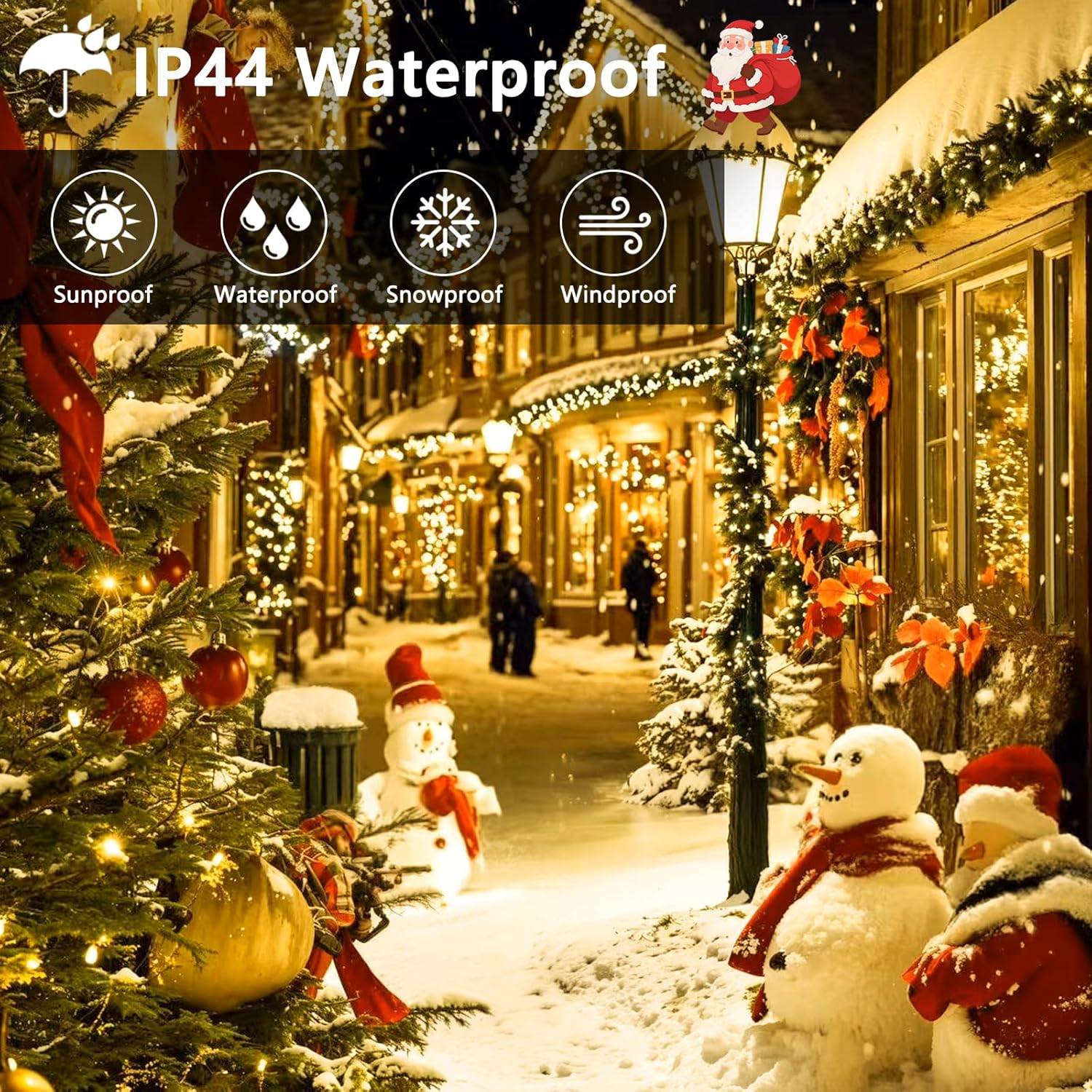 - 【IP44 Waterproof Christmas Lights 】: Our Christmas lights are rated IP44 for reliable waterproofing, meeting strict standards for both indoor and outdoor use. They’re built to resist freezing, ensuring lasting durability even in rain or snow. This makes them a practical choice for hassle-free holiday decorating. Their weather-resistant design means you can leave them up through storms or snow—no need to rush out and adjust them. Just set them up, and watch your home become the brightest spot on the block, rain or shine.