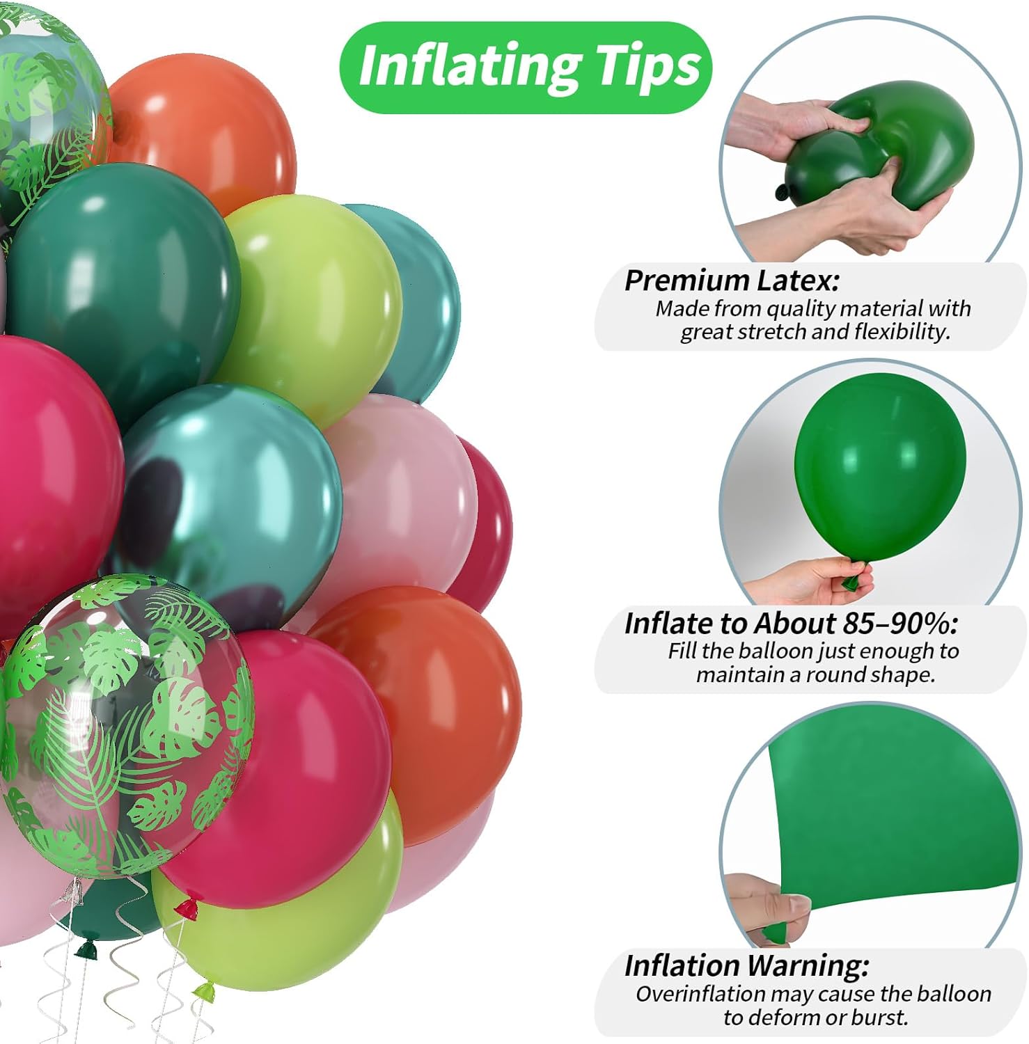 - Helpful Tips: For best results, inflate balloons to 80–90% capacity to prevent popping and ensure longevity. Avoid direct sunlight, extreme heat, and sharp objects. Adult supervision is required, broken or uninflated balloons may pose a choking hazard to children. If you have any questions about your balloons, please contact us. We are committed to providing a swift and helpful resolution