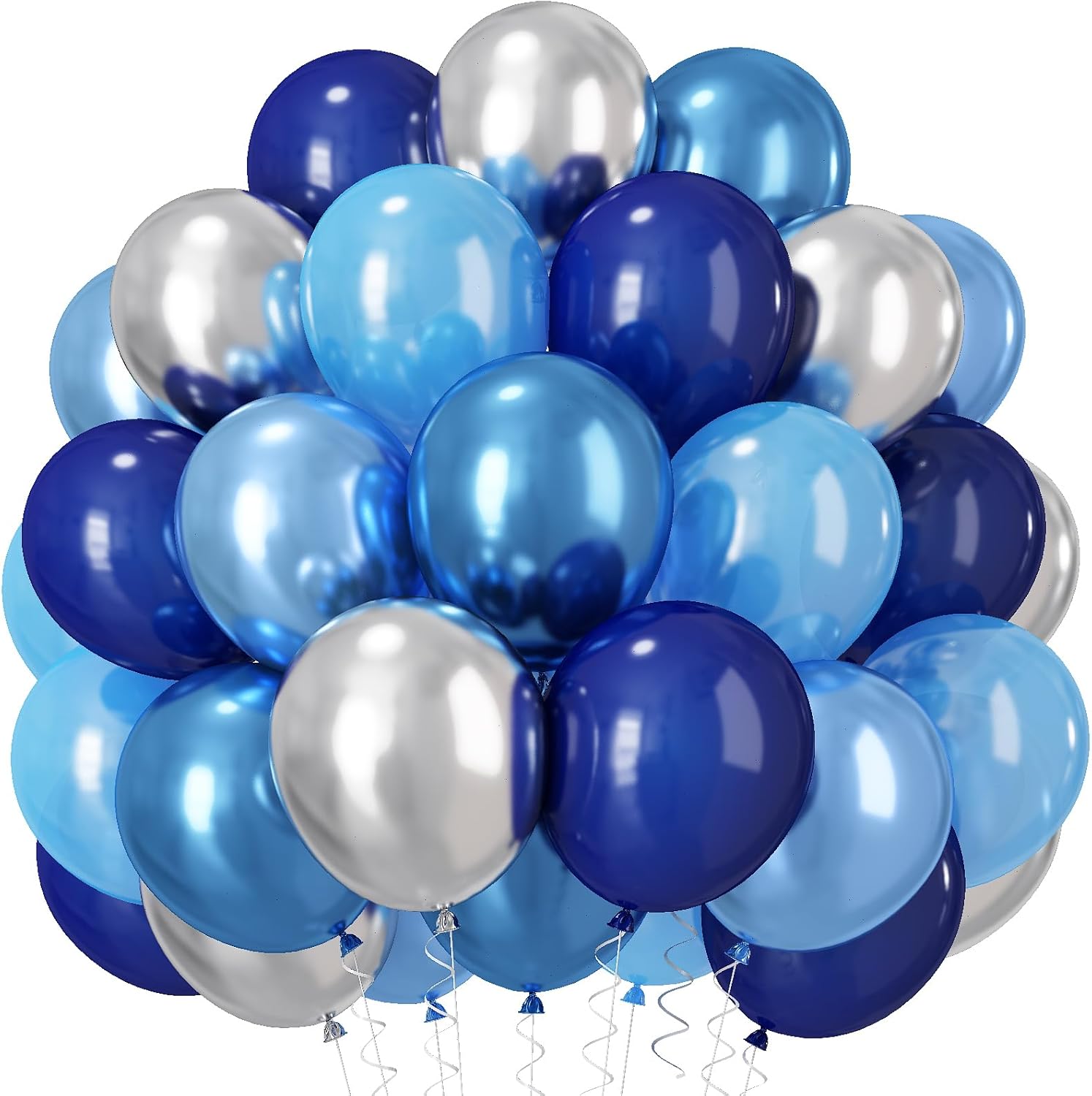- Complete Blue and Silver Balloon Set: This 50 pcs 12 inch blue silver party balloon kit features a stunning, diverse mix including 13 pcs Metallic Silver Balloons, 10 pcs Metallic Baby Blue Baloons, 10 pcs Light Blue Balloon, 10 pcs Pearl Dark Blue Balloons, and 7 pcs Metallic Blue, 1 Balloon Ribbon