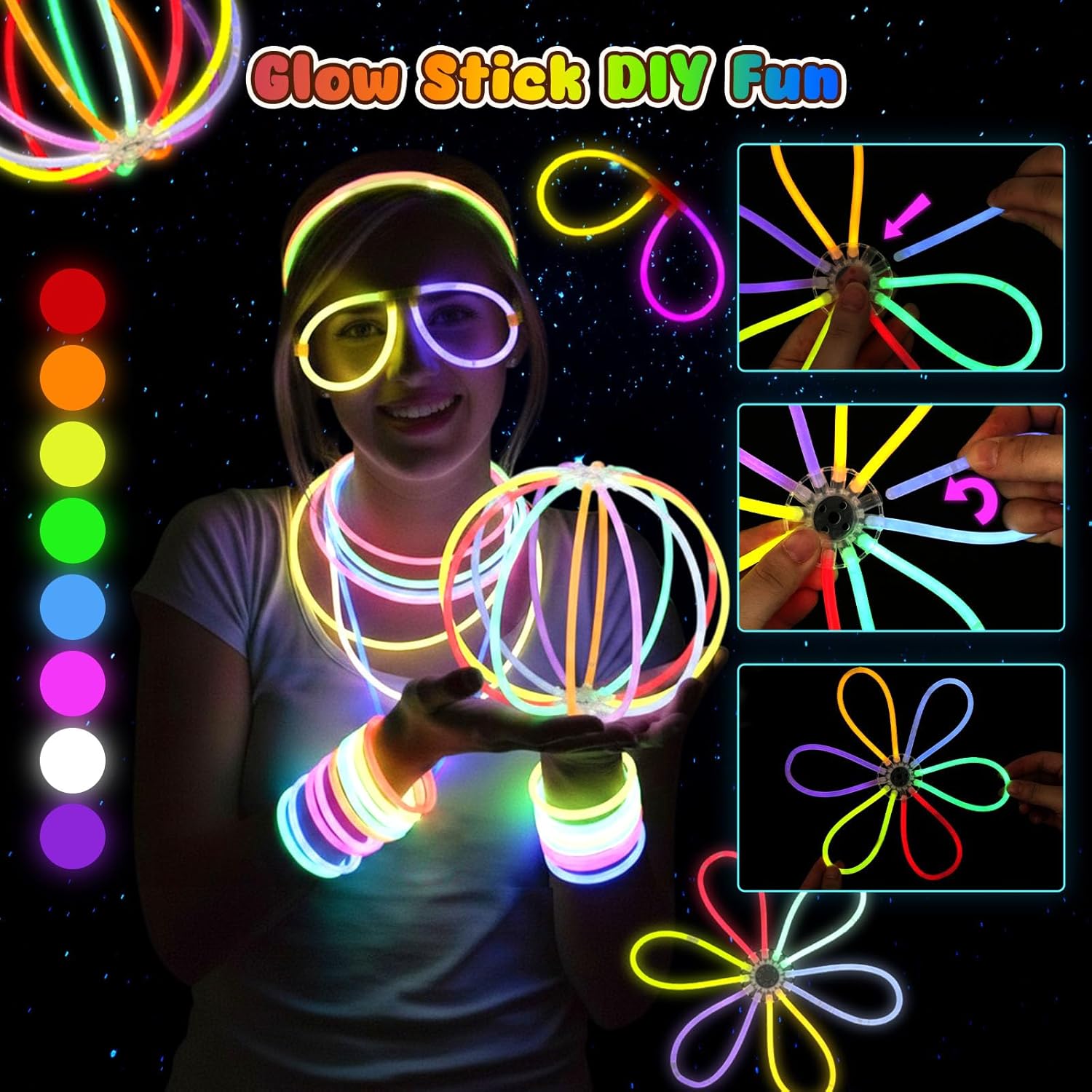 - 【DIY Glow Sticks】: Bend and connect glow sticks into bracelets, necklaces, headbands, or flower shapes. Great for hands-on fun and adding creativity to your glow in the dark party