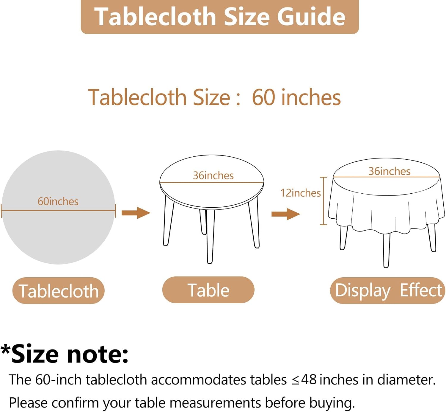 - The Right Size & Perfect Fit Guaranteed: This 60" round tablecloth fits tables up to 48" in diameter. Check your table's dimensions before ordering, and contact us for assistance — we are here to help!