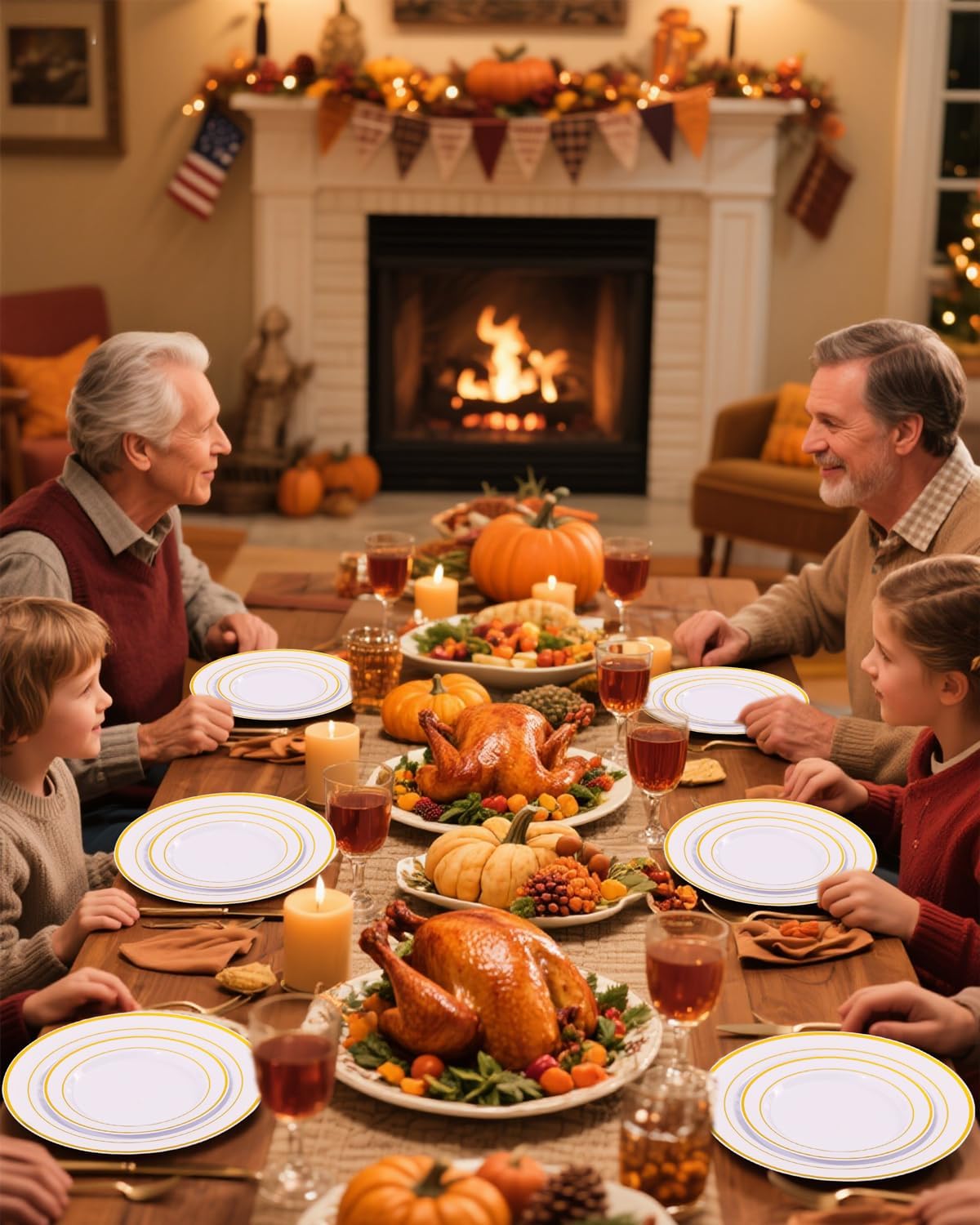 - Feature: Disposable plastic plates and gold plastic silverware sets,throw away after use,popular to any indoor and outdoor party,Thanksgiving/Christmas party decorations,easy to take along with sturdy box.