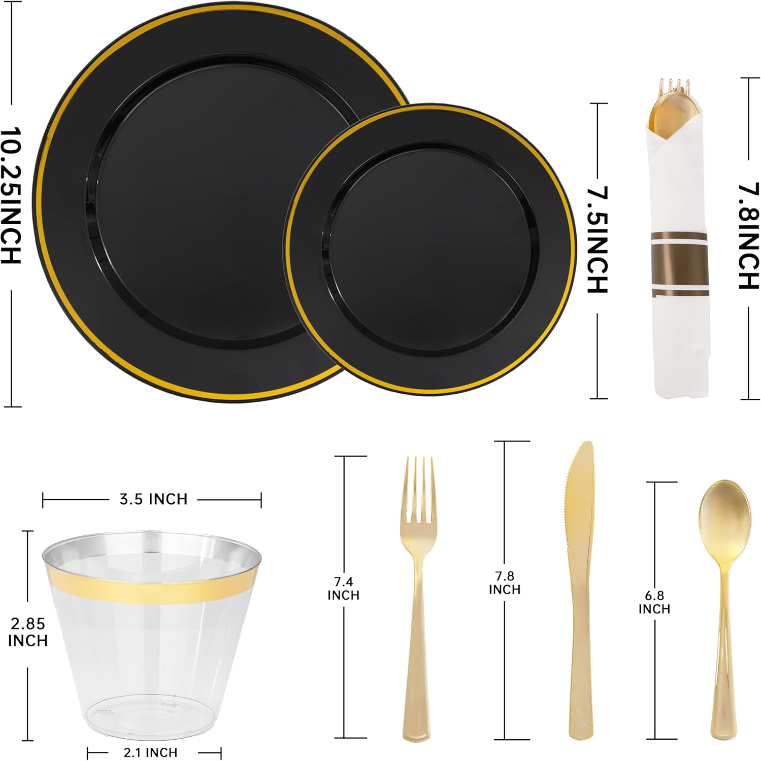 SUT 175 Pcs Black and Gold Plastic Dinnerware Set for 25 Guests, Include: 25 Dinner Plates, 25 Dessert Plates, 25 Pre Rolled Napkins With Silverware, 25 Cups, Disposable Plates for Party