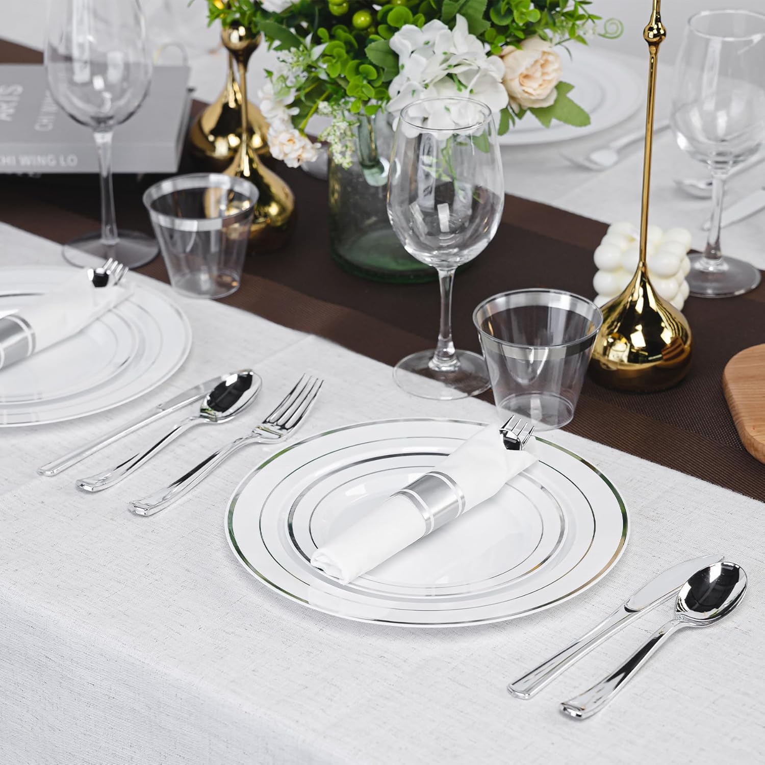 - Modern Silver-Rimmed Design: Elevate any table instantly! The sleek silver rim on these disposable plastic plates mimics chic stainless steel, adding sophisticated elegance to weddings, parties, and holiday feast