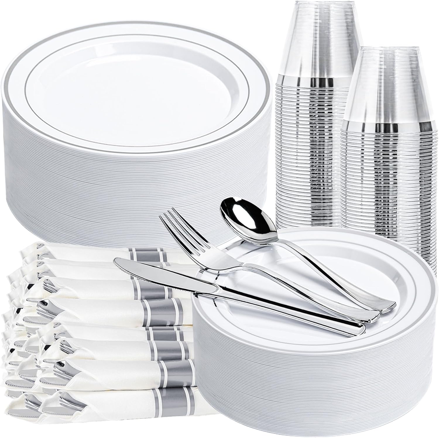- Complete 50-Guest Silver Set: Host effortlessly for 50! This 350-piece disposable dinnerware set provides everything: 50 sturdy silver plastic dinner plates, 50 elegant silver dessert plates, 50 pre-rolled napkins, 50 durable 9oz cups, plus 50 forks, knives & spoon
