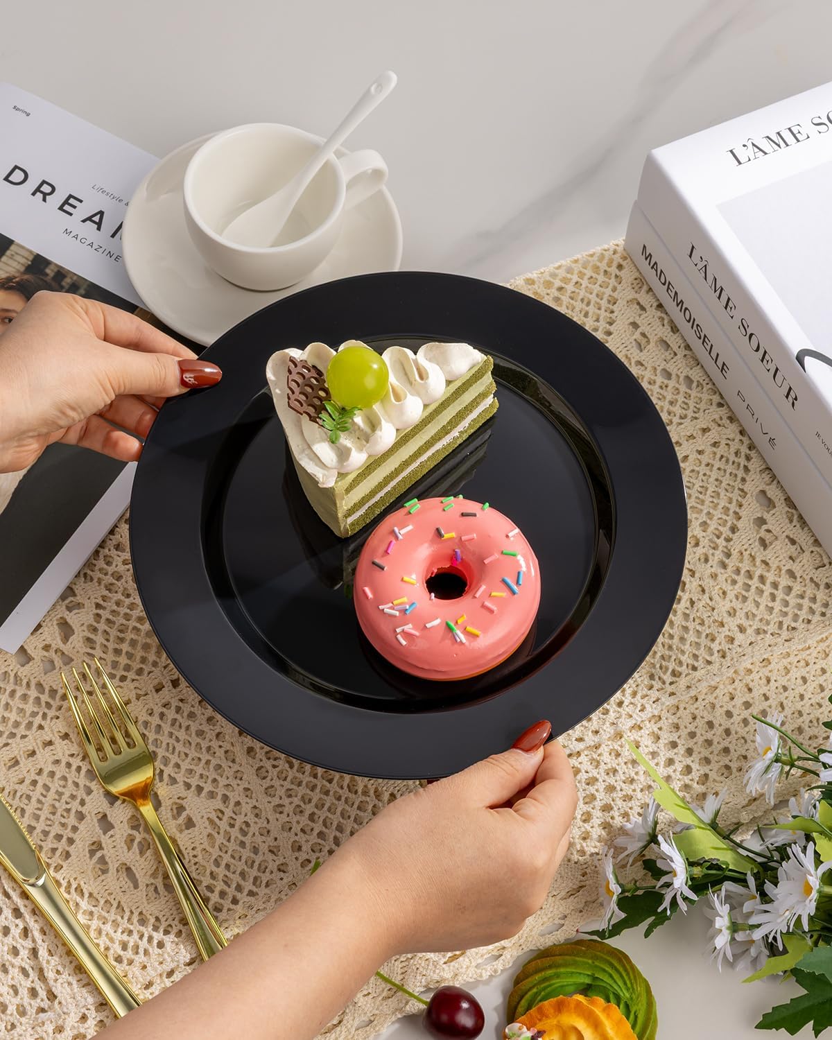 - ELEGANT DESIGN FOR VERSATILE OCCASIONS - With elegant black base, this plastic plate effortlessly fits any occasion, from elegant weddings to casual gatherings. Despite its plastic composition, these party supplies radiate the sophistication of ceramic, elevating the event's allure and making a lasting impact on guests