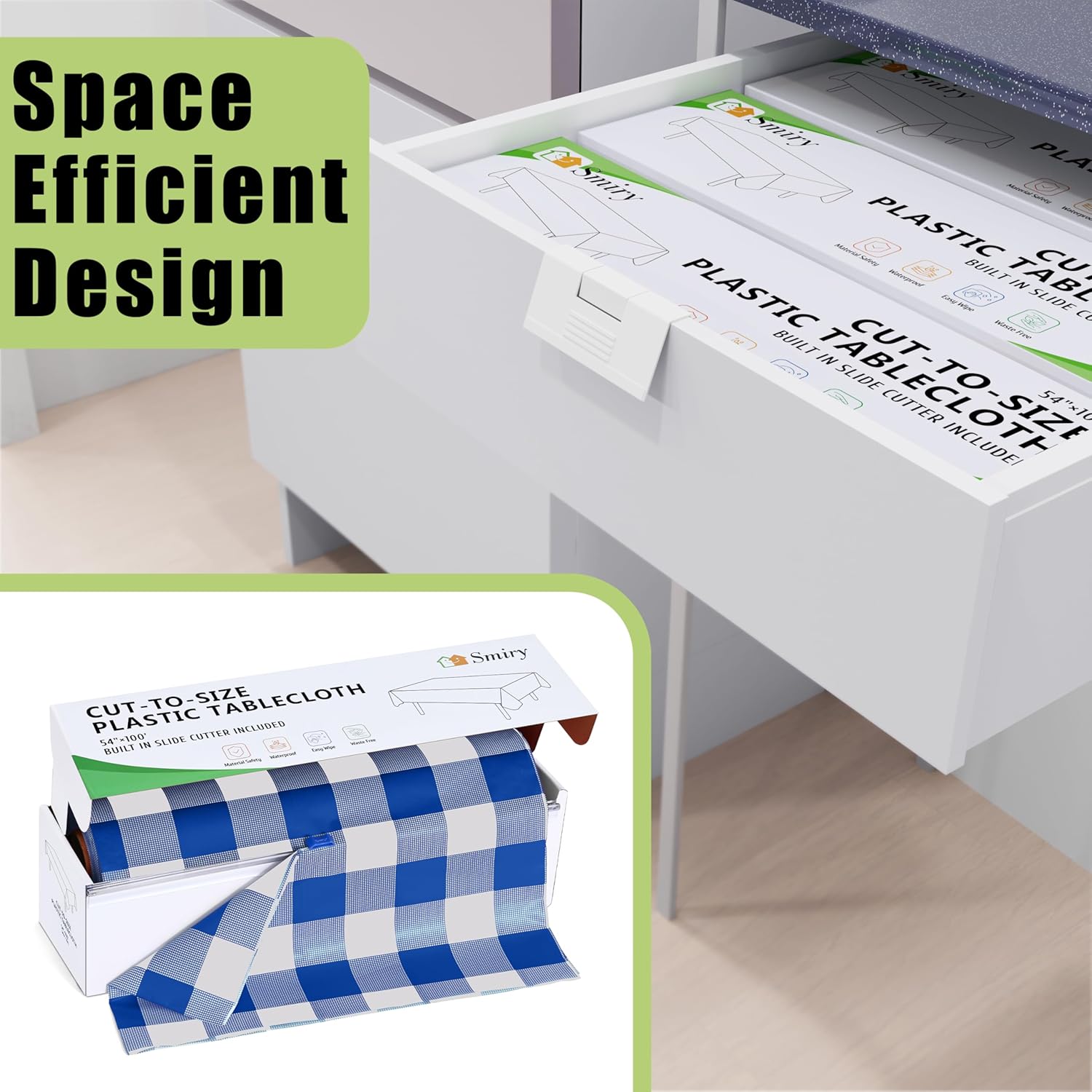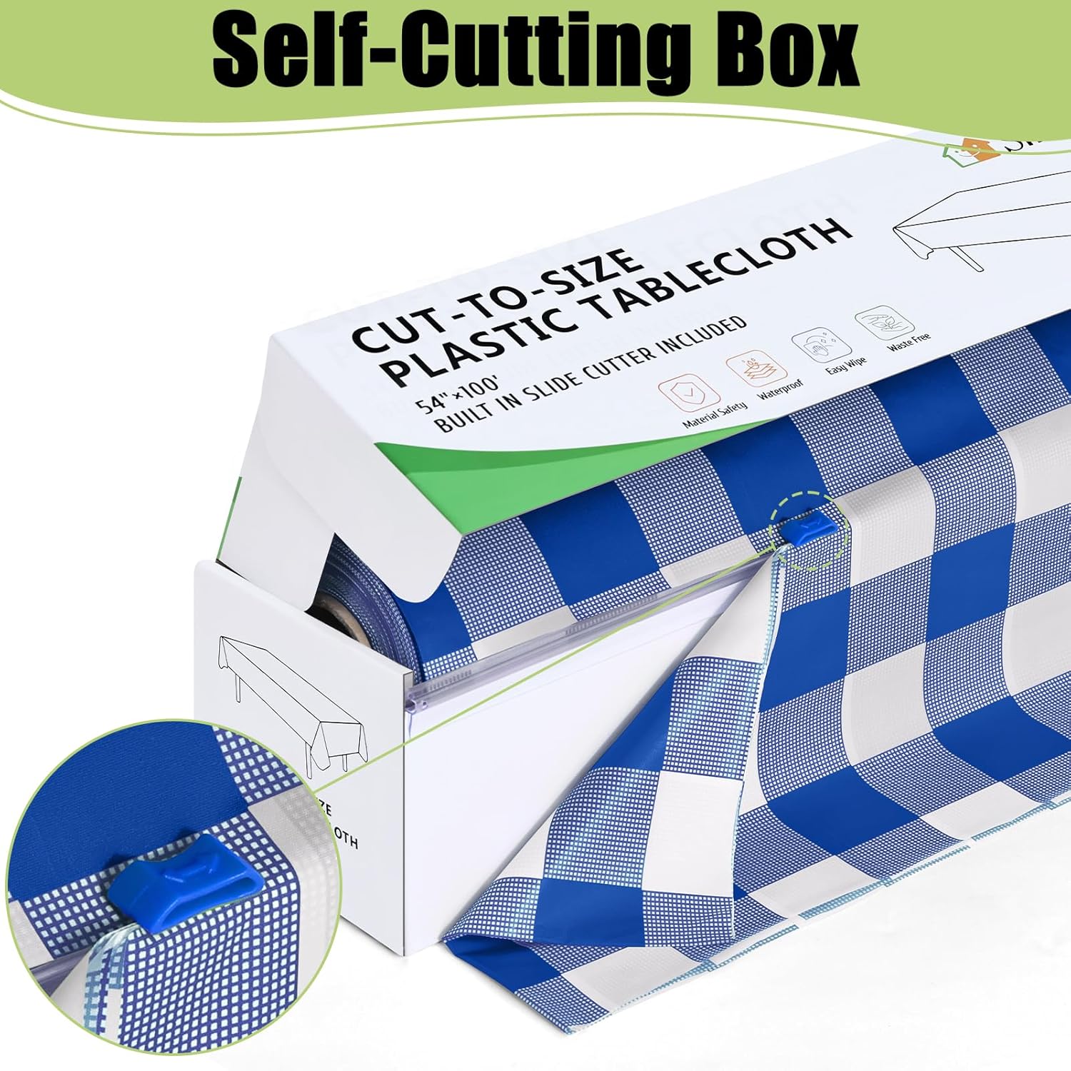 - [Easy Selection of Size with Sliding Cutter] This tablecloth roll comes in a handy box with cut-out tools that allow you to easily cut to the size you need. This plastic table cover roll is suitable match for rectangular, square, round or oval tables.