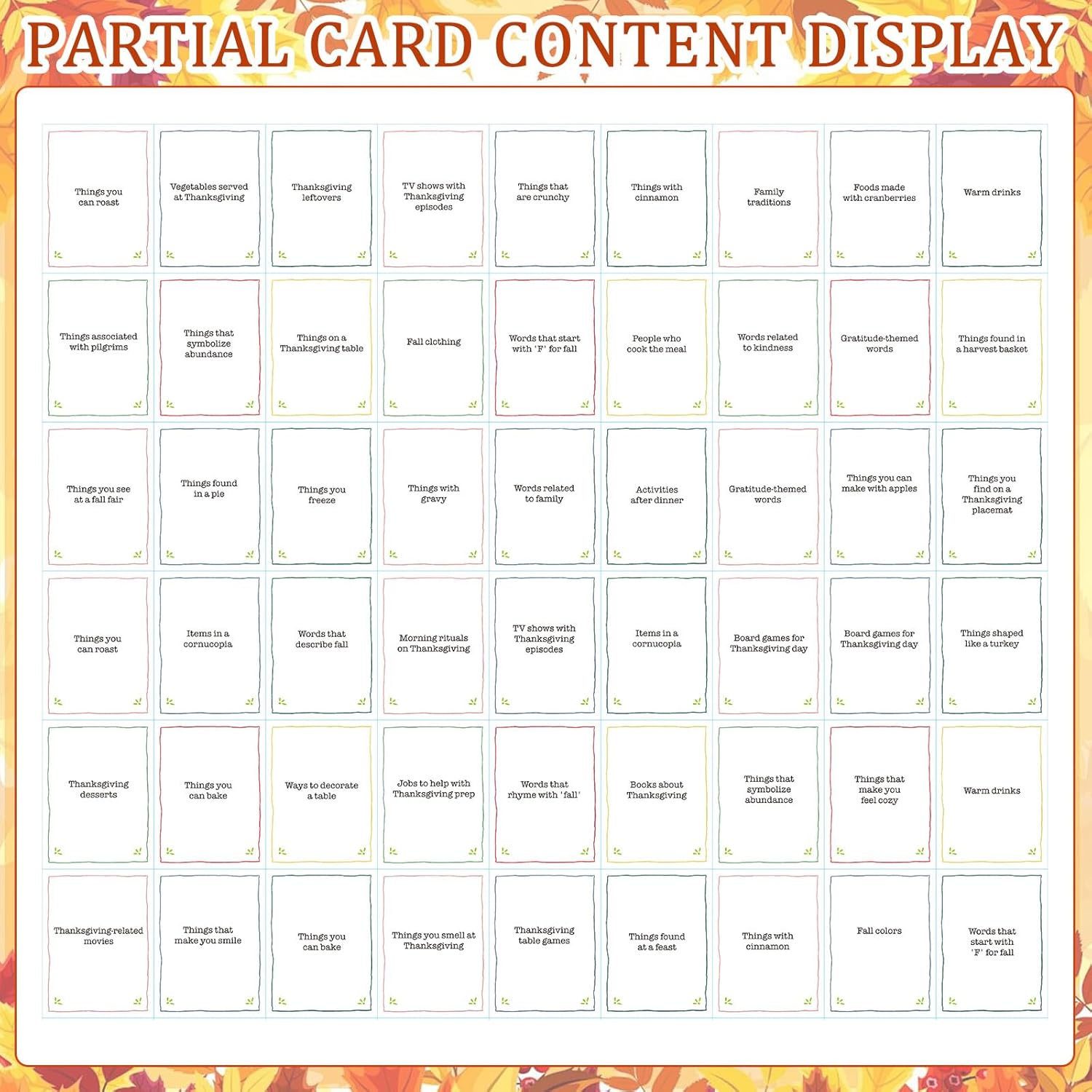 - Package Contents: you will receive 1 set of Thanksgiving party game set, including a 1-minute hourglass timer, 200 hourglass 26 letter cards, 70 double-sided answer boards, and 1 instruction sheet; These Thanksgiving theme cards are allowing them to enjoy the holiday fun and play this fun holiday game