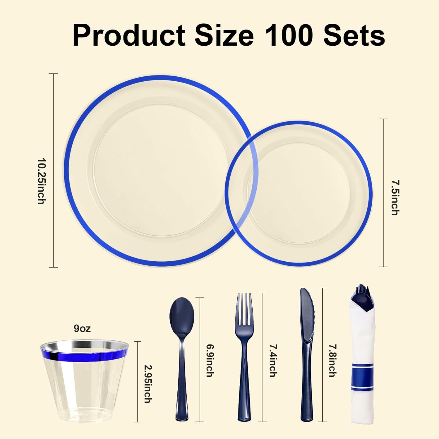 700PCS Clear Blue Disposable Plastic Dinnerware Set for 100 Guests, 200 Plastic Plates, 100 Cups, 100 Pre-Rolled Napkins with Cutlery for Party, Birthday, Christmas, Wedding, Thanksgiving, Halloween