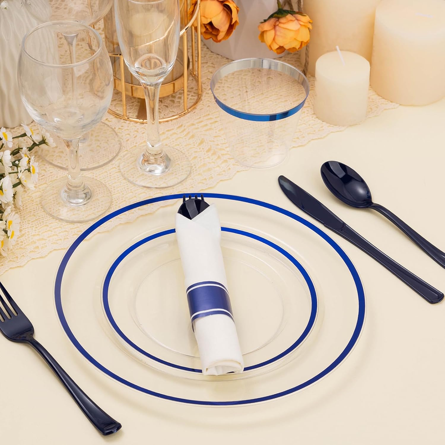 - ELEGANT DESIGN - This disposable party plates set features a sophisticated design with a blue rim and clear plastic plates, offering a coordinated and simply luxurious look. Our blue plates perfectly complement your blue party decorations, adding a touch of elegance to your event.