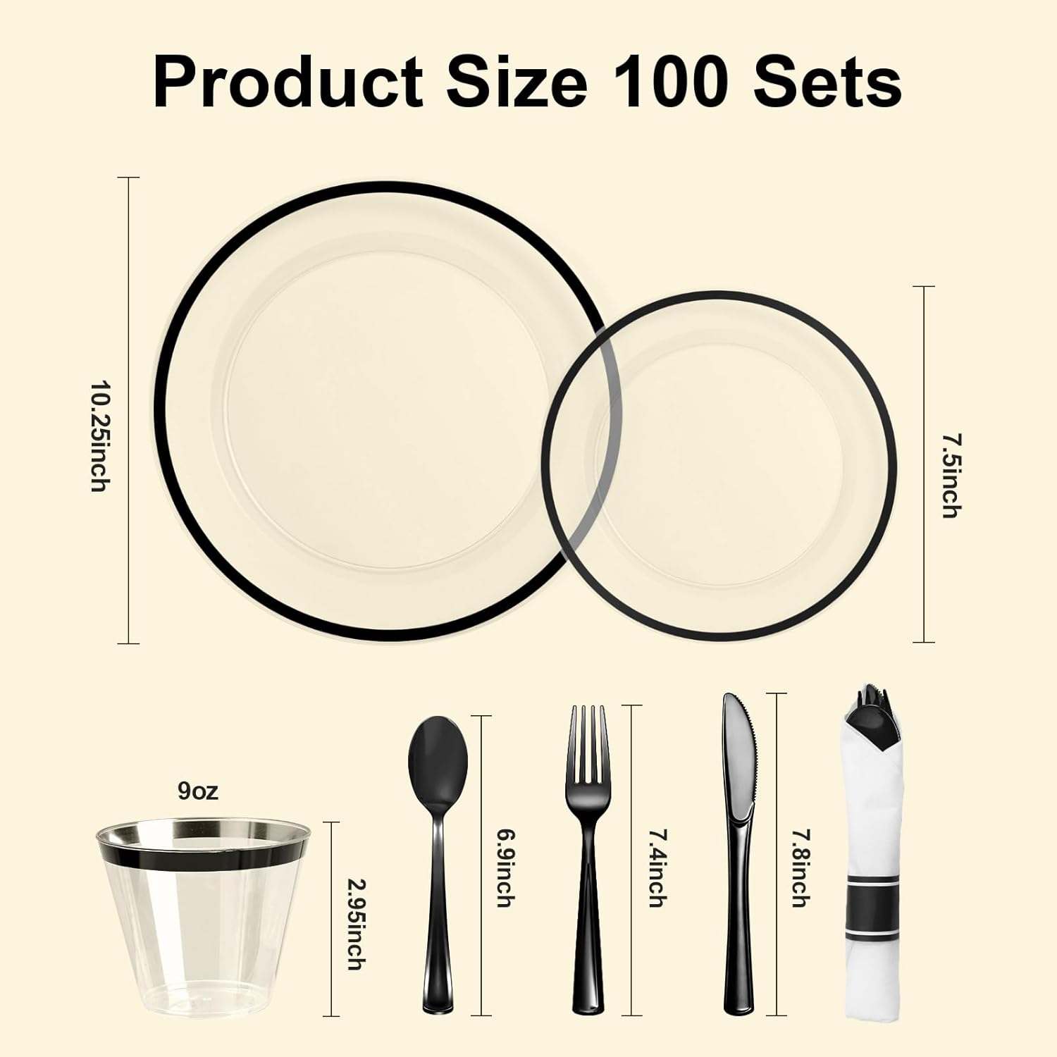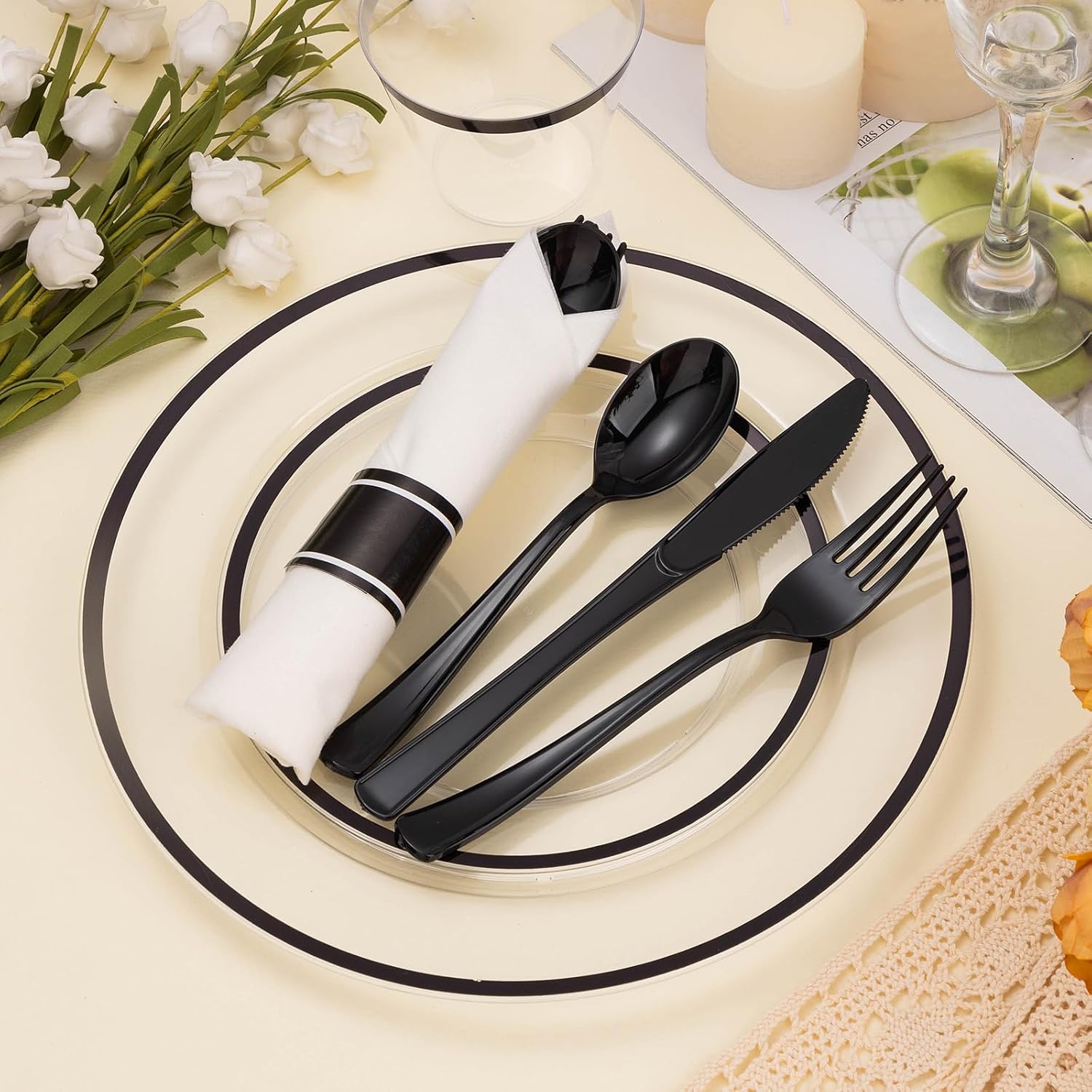 700PCS Clear Black Disposable Plates Set for 100 Guests, 200 Plastic Plates, 100 Plastic Cups, 100 Pre-Rolled Napkins with Cutlery for Party, Christmas, Birthday, Wedding, Thanksgiving, Halloween