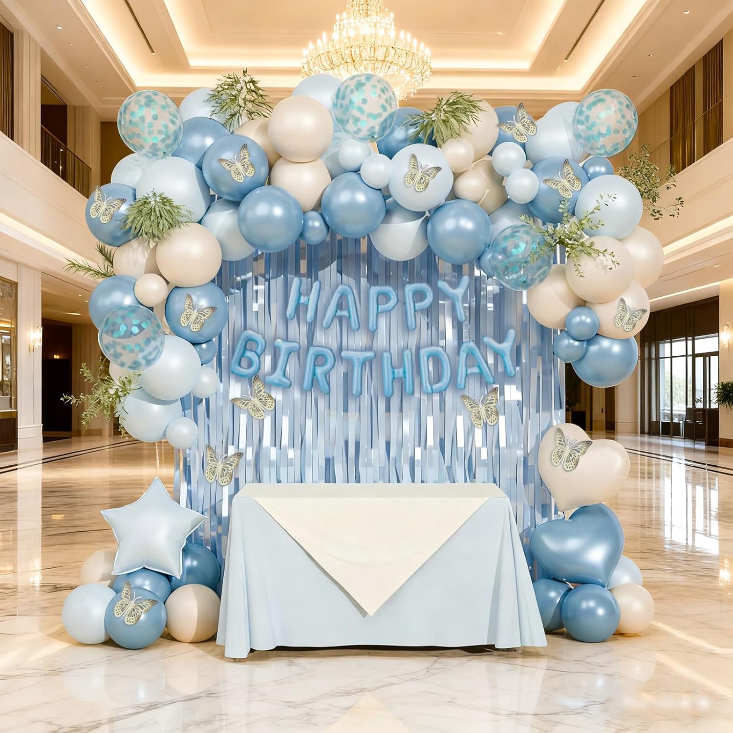 - Complete Blue Party Decorations Set: Create an unforgettable celebration with our all-inclusive blue birthday decorations set. This kit includes 2 shimmering blue foil fringe curtains, 1 foil stars balloon (18”), 2 heart-shaped foil balloons (18”), 13 happy birthday foil balloons, 5 confetti balloons (12”), and 40 high-quality latex balloons in blue, dusty blue, and sand white. Plus, 15 mini balloons, 12 stunning gold butterfly wall decor pieces, a ribbon, balloon strip, and glue dots for easy assembly. Everything you need to set the perfect birthday scene!