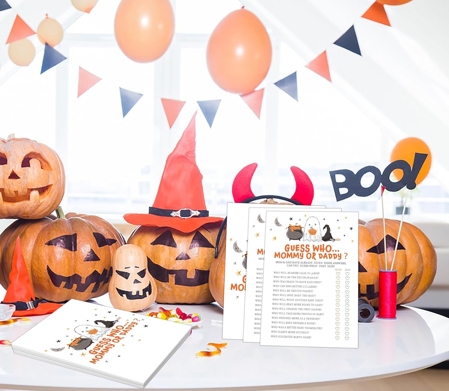 Halloween Mommy or Daddy Baby Shower Game, 30 Halloween Gender Reveal Games for Guests, 5x7 inch, Perfect for Neutral Gender Reveal Decorations Party Favors Supplies