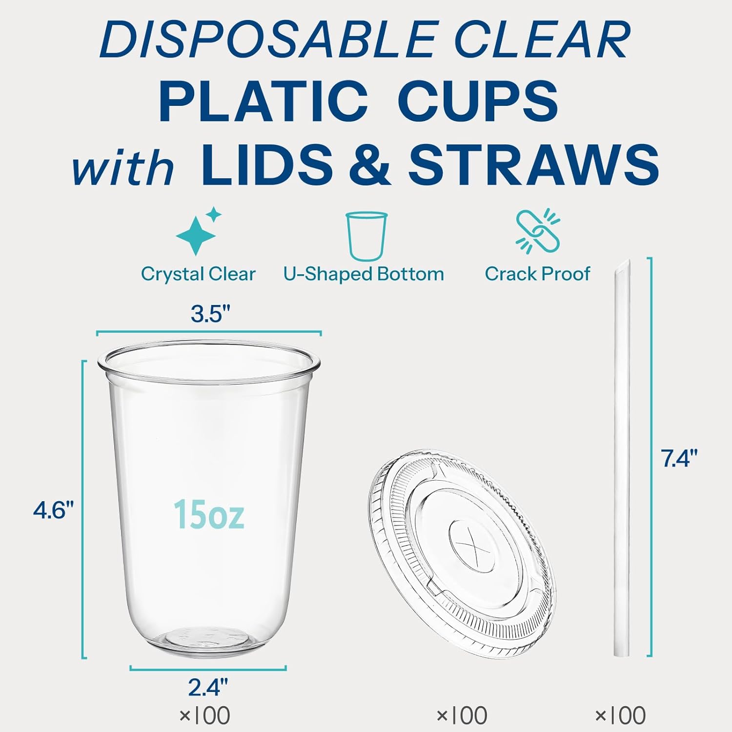 - 【100 Value Packs: Everything You Need for Cold Drinks】 Each set has 100 15 oz clear plastic cups with lids and straws — 100 leak-proof lids, 100 thickened food-grade straws, 100 cups. It’s enough for coffee shops, bubble tea stores, or large events (weddings, graduations) — no separate purchases needed. The 15 oz capacity fits large cold drinks: iced coffee, thick smoothies, frozen cocktails, bubble tea (with small toppings), covering commercial and home needs.