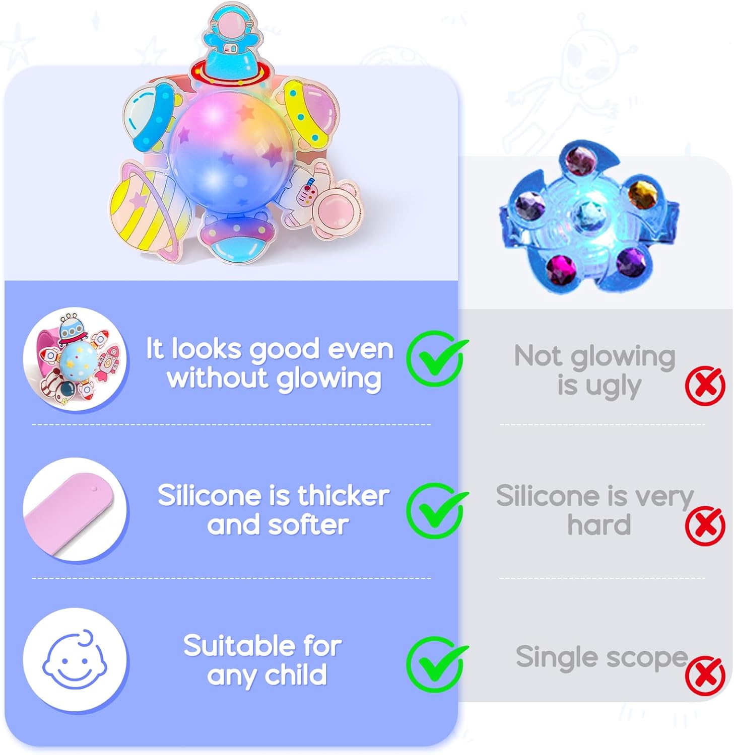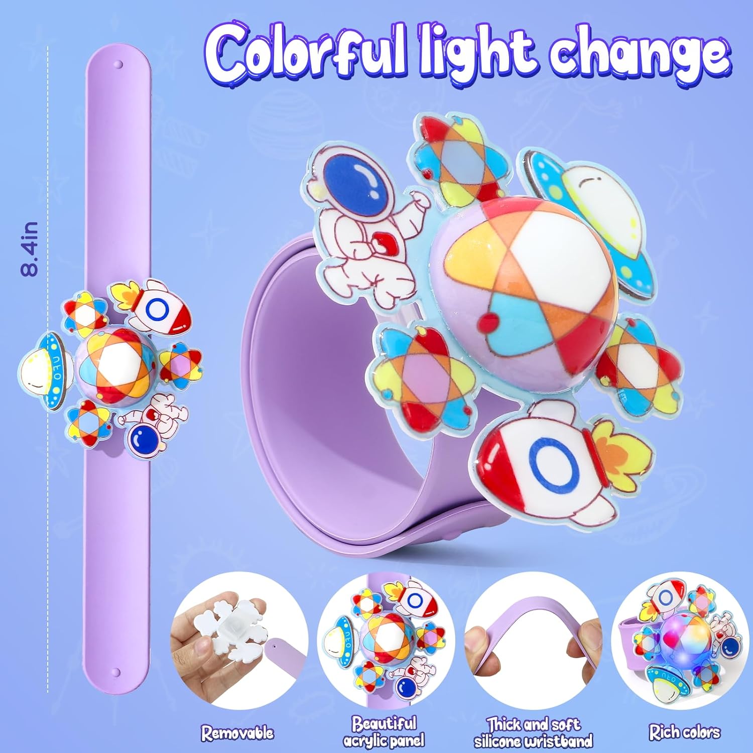 - 12 PCS ROTATING LIGHT UP SPACE SLAP BRACELETS: includes 6 different styles, a set of 12. Each style includes a space-themed rotating light up toy and a silicone slap bracelet, which is very suitable for children who love space and the universe.