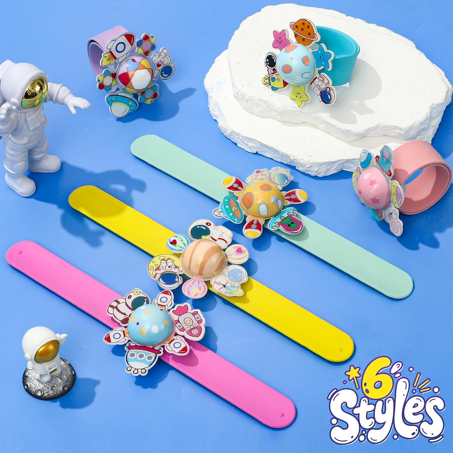 - SPACE THEMED DESIGN, ROTATING AND GLOW EFFECT: This slap bracelet is colorful and bright, with a unique space theme design, including elements such as planets, astronauts, UFOs, rockets, aliens, etc. It will glow when it rotates, satisfying the play needs during the day and at night at the same time, adding fun to children.