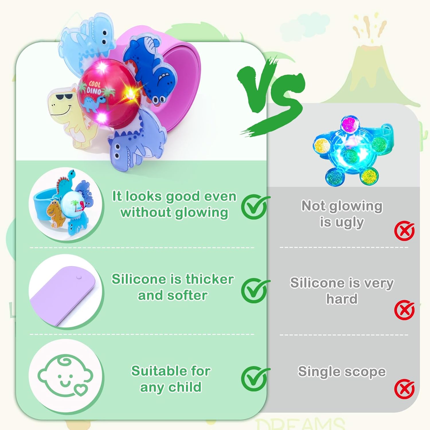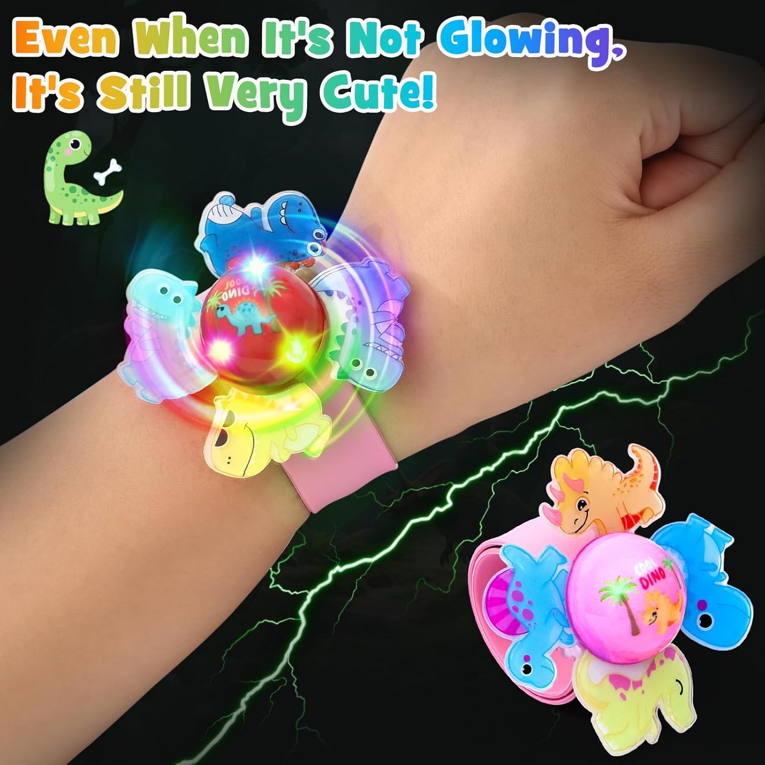 - 12 PCS ROTATING LIGHT UP DINOSAUR SLAP BRACELETS: includes 6 different styles, a set of 12. Each style includes a dinosaur-themed rotating light up toy and a silicone slap bracelet, which is very suitable for children who love dinosaur.