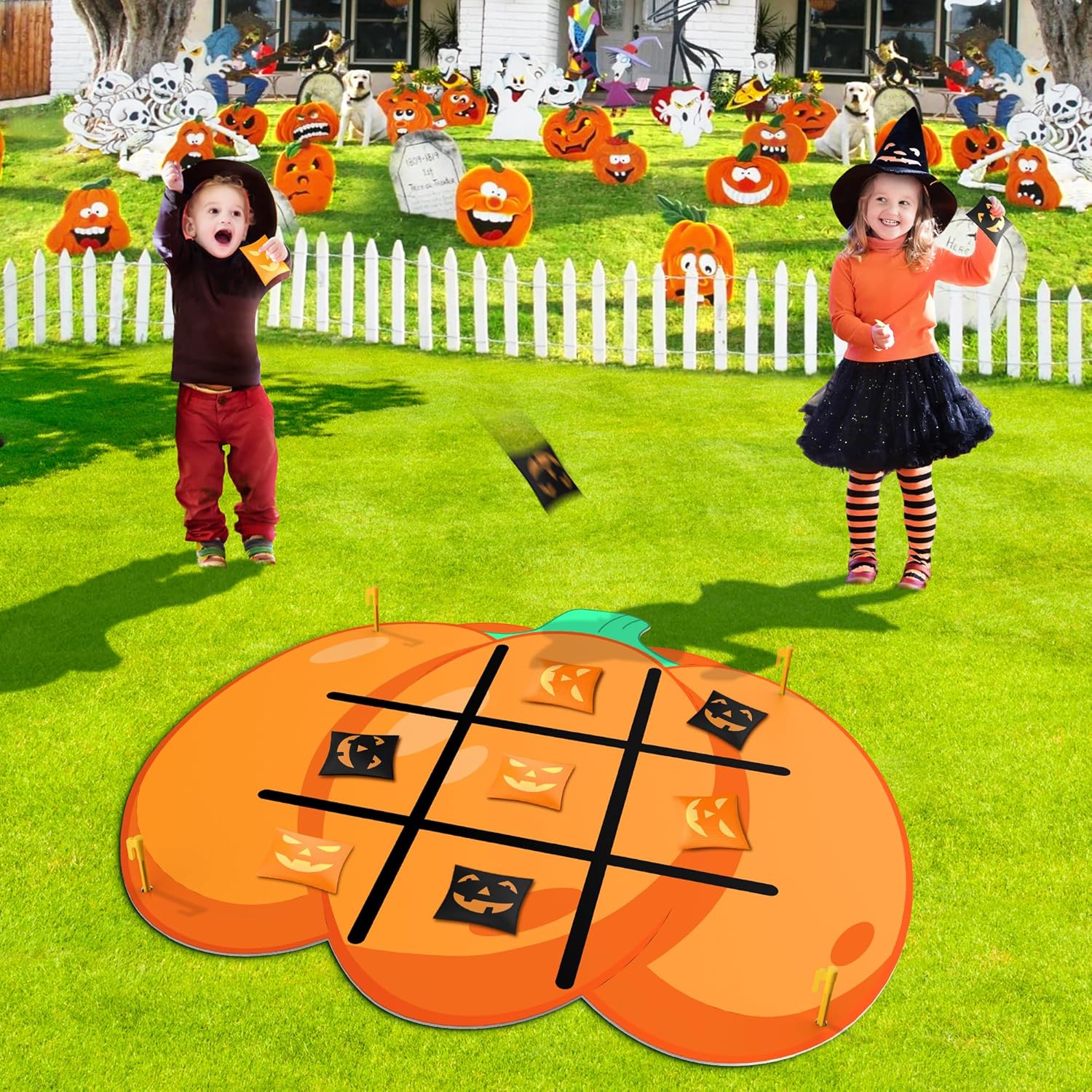 - Durable Construction: Crafted from high-quality felt, this pumpkin tic-tac-toe beanbag toss set is eco-friendly and long-lasting, resisting wear and tear for repeated play by family games for kids and adults. Four stakes secure it firmly to grass surfaces.